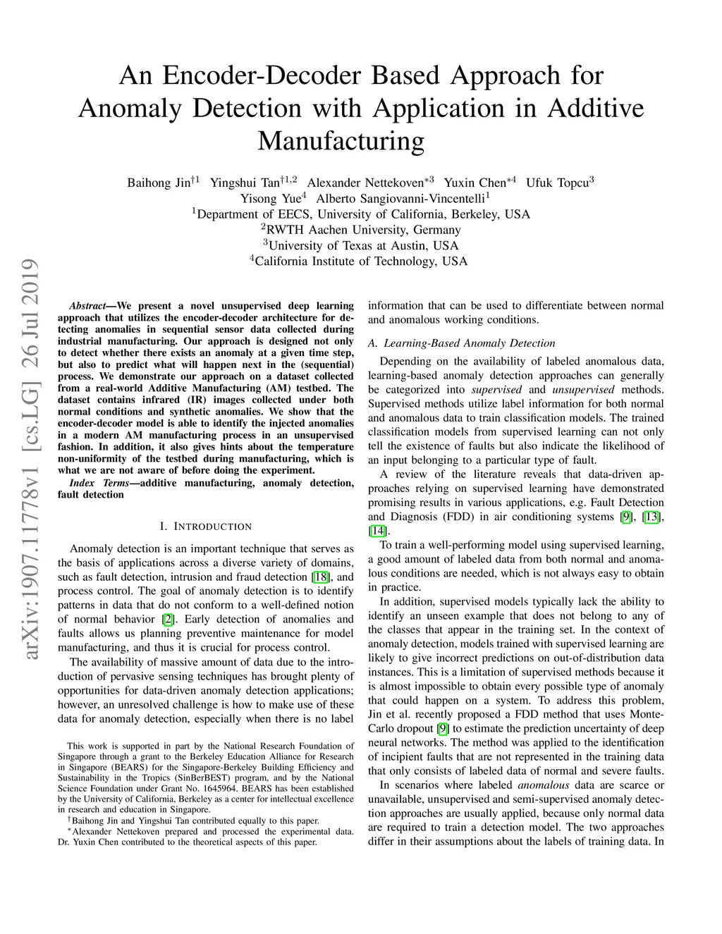 We present a novel unsupervised deep learning approach that utilizes the encoder-decoder architecture for detecting anomalies in sequential sensor data collected during industrial manufacturing. Our approach is designed not only to detect whether there exists an anomaly at a given time step, but also to predict what will happen next in the (sequential) process. We demonstrate our approach on a dataset collected from a real-world testbed. The dataset contains images collected under both normal conditions and synthetic anomalies. We show that the encoder-decoder model is able to identify the injected anomalies in a modern manufacturing process in an unsupervised fashion. In addition, it also gives hints about the temperature non-uniformity of the testbed during manufacturing, which is what we are not aware of before doing the experiment.