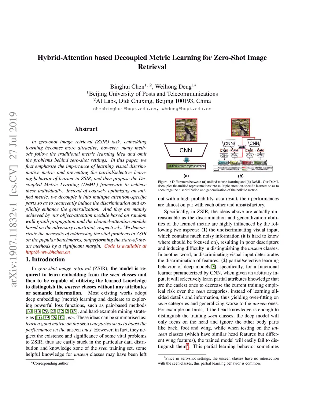 Hybrid-Attention based Decoupled Metric Learning for Zero-Shot Image