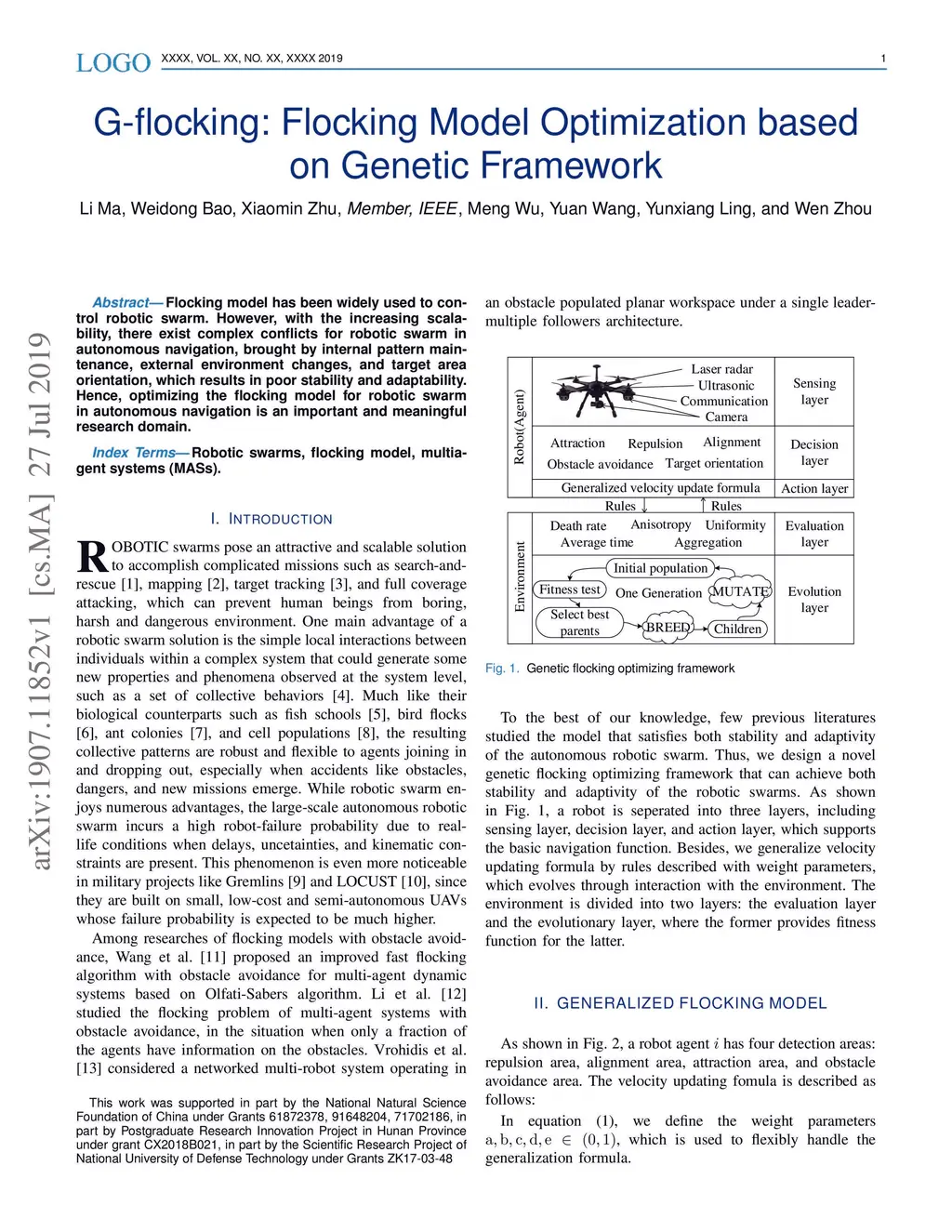 Flocking model has been widely used to control robotic swarm. However, with the increasing scalability, there exist complex conflicts for robotic swarm in autonomous navigation, brought by internal pattern maintenance, external environment changes, and target area orientation, which results in poor stability and adaptability. Hence, optimizing the flocking model for robotic swarm in autonomous navigation is an important and meaningful research domain.