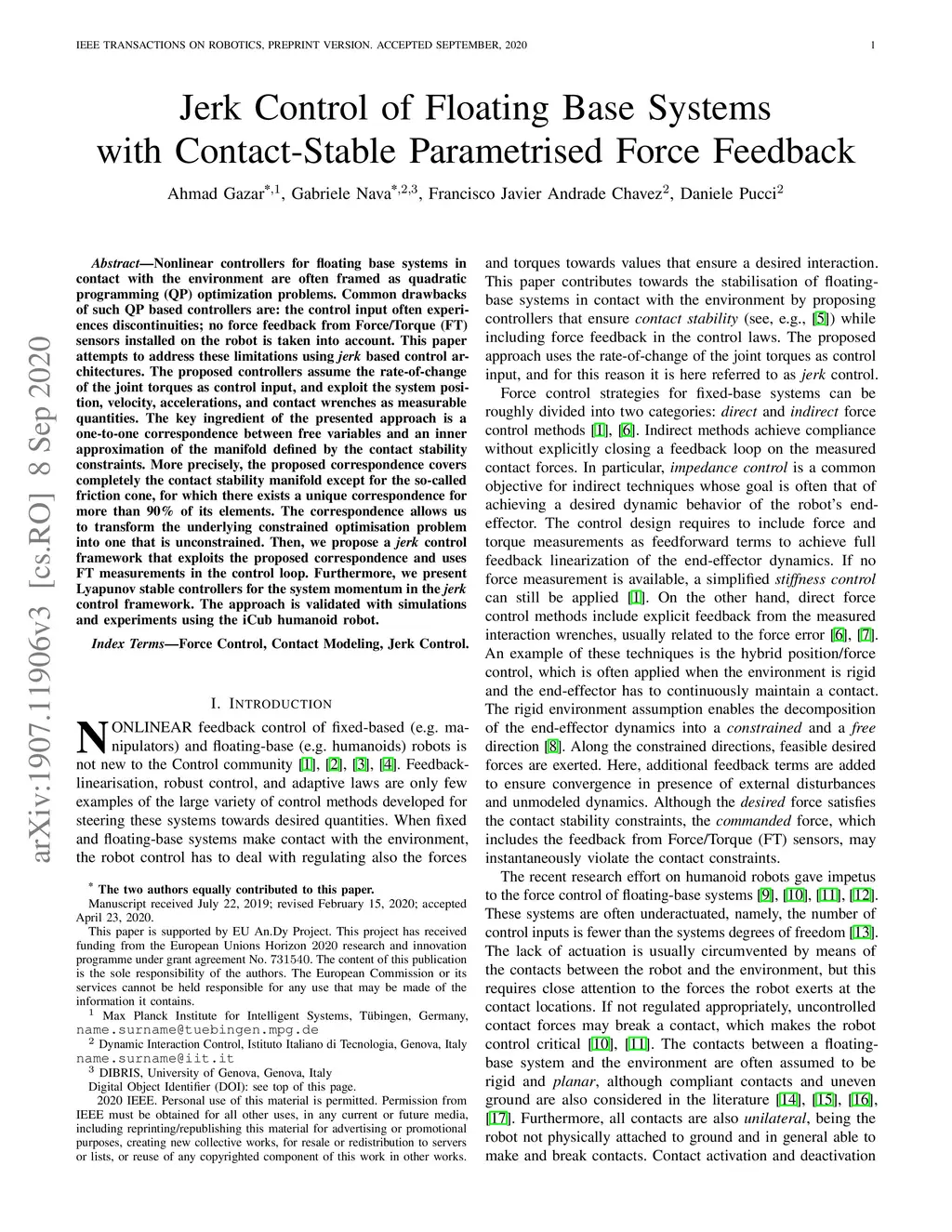 Jerk Control of Floating Base Systems with Contact-Stable Parametrised