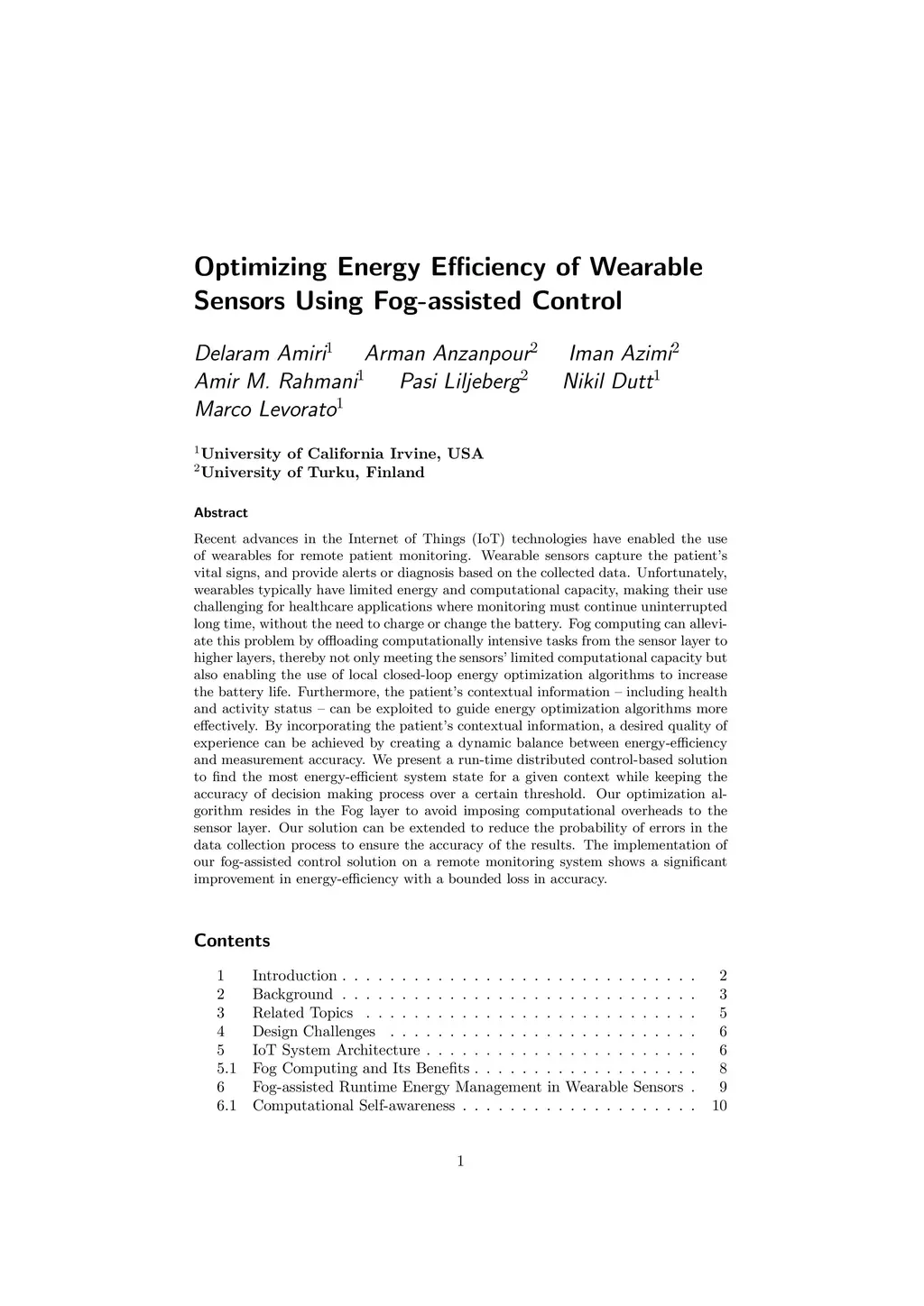 Recent advances in the Internet of Things (IoT) technologies have enabled the use of wearables for remote patient monitoring. Wearable sensors capture the patient's vital signs, and provide alerts or diagnosis based on the collected data. Unfortunately, wearables typically have limited energy and computational capacity, making their use challenging for healthcare applications where monitoring must continue uninterrupted long time, without the need to charge or change the battery. Fog computing can alleviate this problem by offloading computationally intensive tasks from the sensor layer to higher layers, thereby not only meeting the sensors' limited computational capacity but also enabling the use of local closed-loop energy optimization algorithms to increase the battery life.
