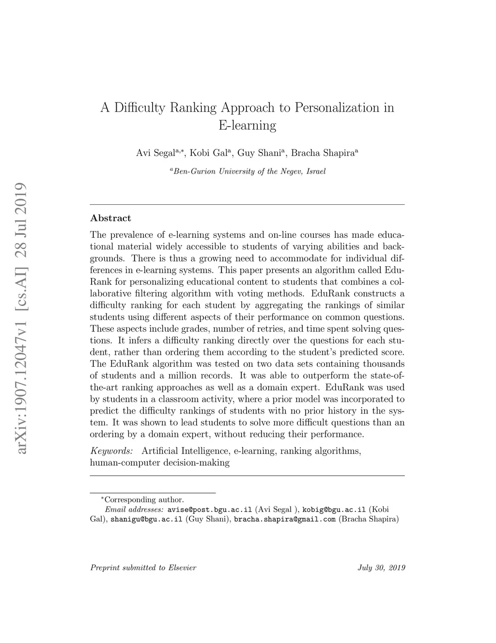 A difficulty ranking approach to personalization in E-learning
