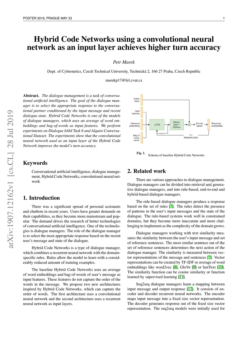 The dialogue management is a task of conversational artificial intelligence. The goal of the dialogue manager is to select the appropriate response to the conversational partner conditioned by the input message and recent dialogue state. Hybrid Code Networks is one of the models of dialogue managers, which uses an average of word embeddings and bag-of-words as input features. We perform experiments on Dialogue bAbI Task 6 and Alquist Conversational Dataset. The experiments show that the convolutional neural network used as an input layer of the Hybrid Code Network improves the model's turn accuracy.