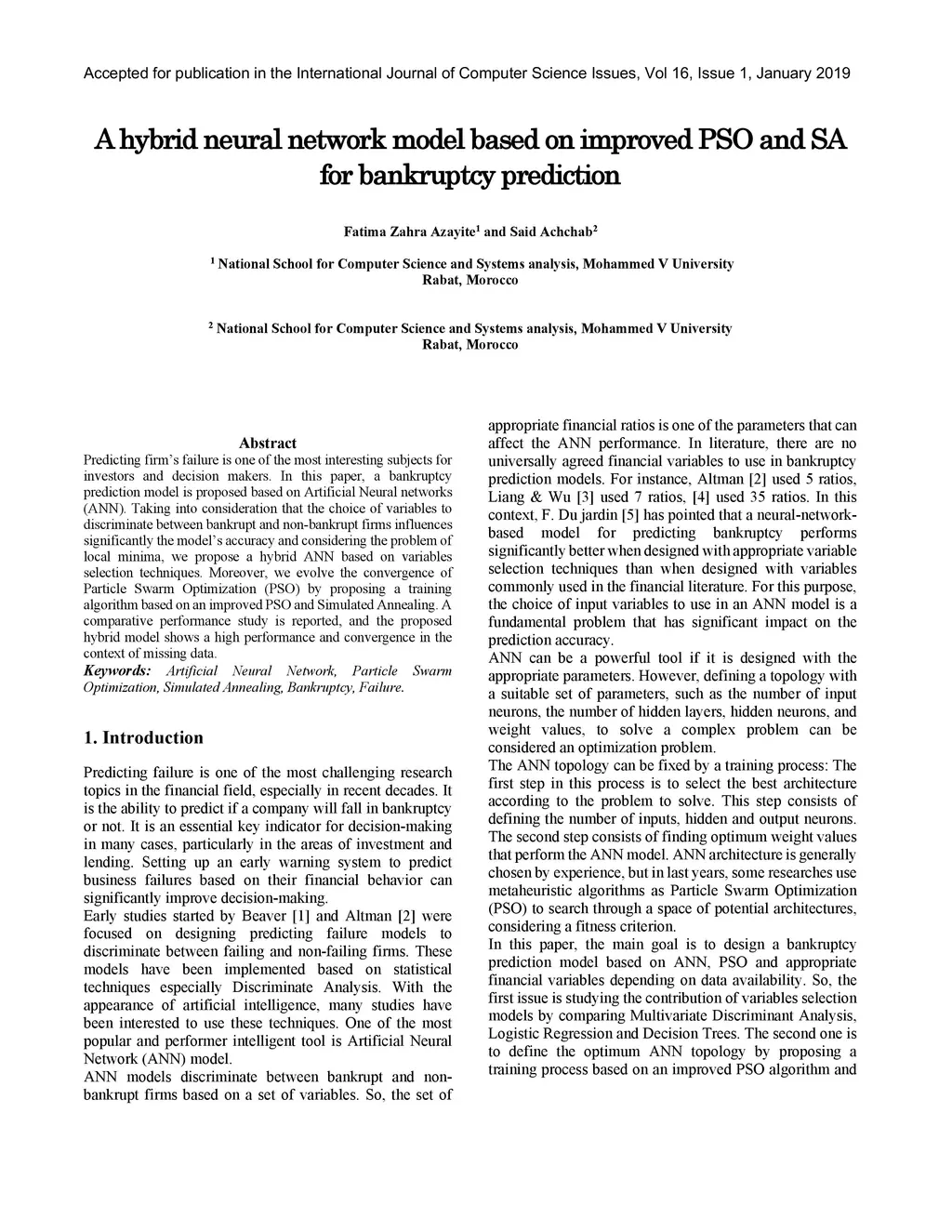 Predicting firm's failure is one of the most interesting subjects for investors and decision makers. In this paper, a bankruptcy prediction model is proposed based on Artificial Neural networks (ANN). Taking into consideration that the choice of variables to discriminate between bankrupt and non-bankrupt firms influences significantly the model's accuracy and considering the problem of local minima, we propose a hybrid ANN based on variables selection techniques. Moreover, we evolve the convergence of Particle Swarm Optimization (PSO) by proposing a training algorithm based on an improved PSO and Simulated Annealing. A comparative performance study is reported, and the proposed hybrid model shows a high performance and convergence in the context of missing data.