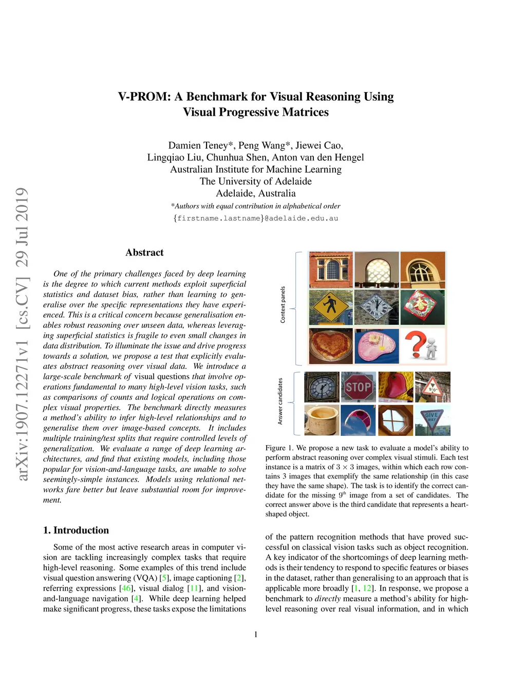One of the primary challenges faced by deep learning is the degree to which current methods exploit superficial statistics and dataset bias, rather than learning to generalise over the specific representations they have experienced. This is a critical concern because generalisation enables robust reasoning over unseen data, whereas leveraging superficial statistics is fragile to even small changes in data distribution. To illuminate the issue and drive progress towards a solution, we propose a test that explicitly evaluates abstract reasoning over visual data. We introduce a large-scale benchmark of visual questions that involve operations fundamental to many high-level vision tasks, such as comparisons of counts and logical operations on complex visual properties. The benchmark directly measures a method's ability to infer high-level relationships and to generalise them over image-based concepts. It includes multiple training/test splits that require controlled levels of generalization. We evaluate a range of deep learning architectures, and find that existing models, including those popular for vision-and-language tasks, are unable to solve seemingly-simple instances. Models using relational networks fare better but leave substantial room for improvement.