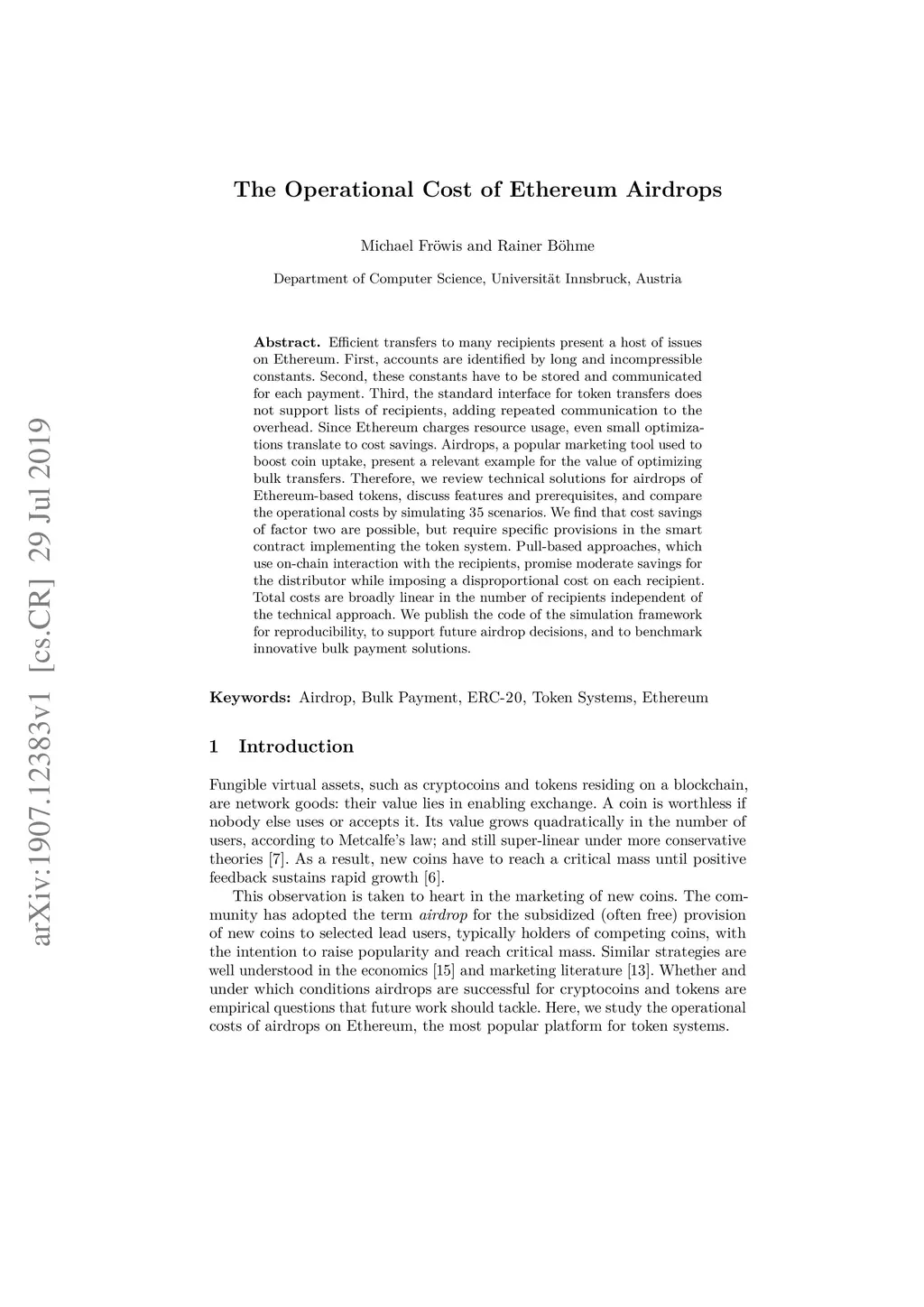 Efficient transfers to many recipients present a host of issues on Ethereum. First, accounts are identified by long and incompressible constants. Second, these constants have to be stored and communicated for each payment. Third, the standard interface for token transfers does not support lists of recipients, adding repeated communication to the overhead. Since Ethereum charges resource usage, even small optimizations translate to cost savings. Airdrops, a popular marketing tool used to boost coin uptake, present a relevant example for the value of optimizing bulk transfers. Therefore, we review technical solutions for airdrops of Ethereum-based tokens, discuss features and prerequisites, and compare the operational costs by simulating 35 scenarios. We find that cost savings of factor two are possible, but require specific provisions in the smart contract implementing the token system. Pull-based approaches, which use on-chain interaction with the recipients, promise moderate savings for the distributor while imposing a disproportional cost on each recipient. Total costs are broadly linear in the number of recipients independent of the technical approach. We publish the code of the simulation framework for reproducibility, to support future airdrop decisions, and to benchmark innovative bulk payment solutions.
