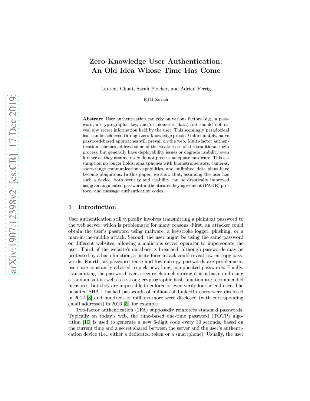 User authentication can rely on various factors (e.g., a password, a cryptographic key, biometric data) but should not reveal any secret or private information. This seemingly paradoxical feat can be achieved through zero-knowledge proofs. Unfortunately, naive password-based approaches still prevail on the web. Multi-factor authentication schemes address some of the weaknesses of the traditional login process, but generally have deployability issues or degrade usability even further as they assume users do not possess adequate hardware. This assumption no longer holds: smartphones with biometric sensors, cameras, short-range communication capabilities, and unlimited data plans have become ubiquitous. In this paper, we show that, assuming the user has such a device, both security and usability can be drastically improved using an augmented password-authenticated key agreement (PAKE) protocol and message authentication codes.