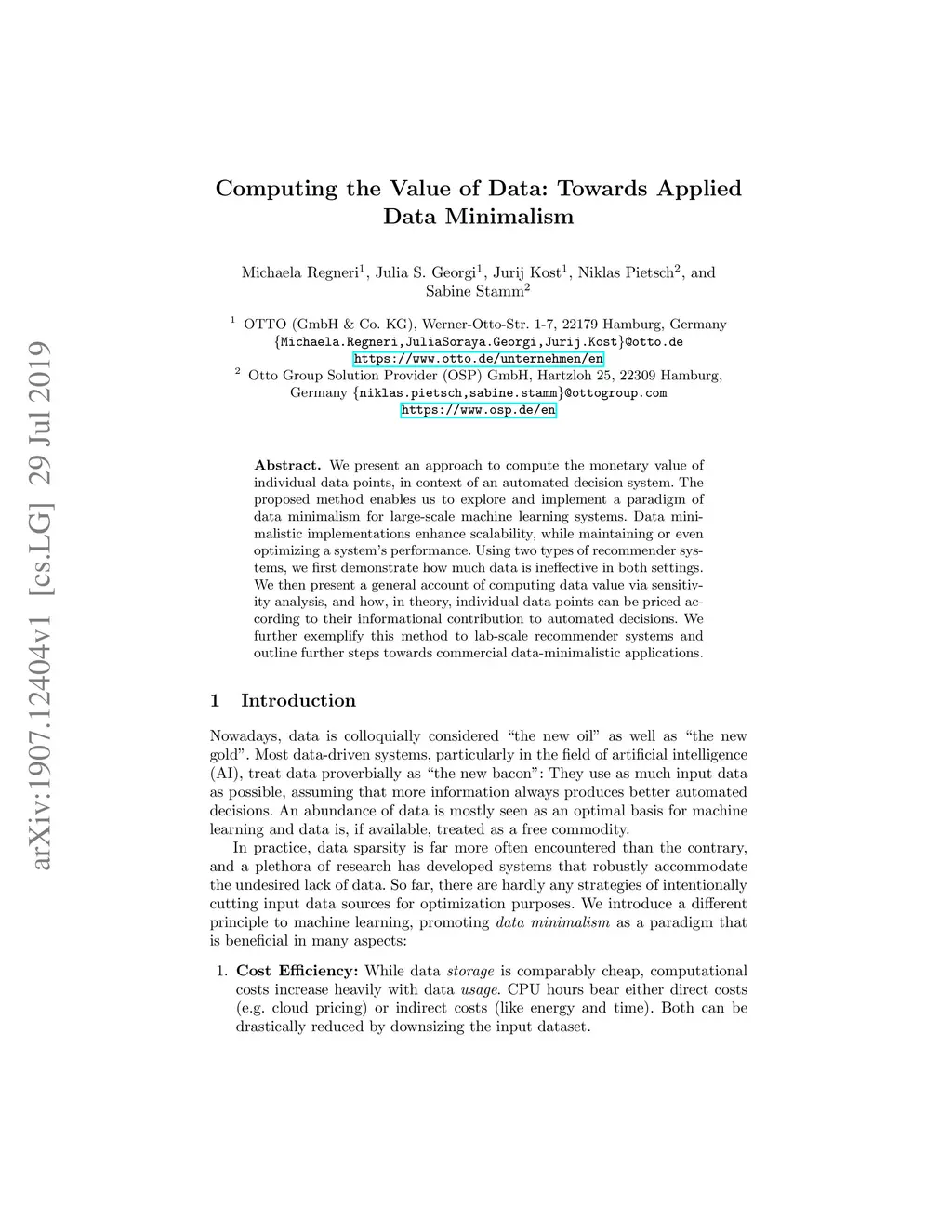 We present an approach to compute the monetary value of individual data points, in context of an automated decision system. The proposed method enables us to explore and implement a paradigm of data minimalism for large-scale machine learning systems. Data minimalistic implementations enhance scalability, while maintaining or even optimizing a system's performance. Using two types of recommender systems, we first demonstrate how much data is ineffective in both settings. We then present a general account of computing data value via sensitivity analysis, and how, in theory, individual data points can be priced according to their informational contribution to automated decisions. We further exemplify this method to lab-scale recommender systems and outline further steps towards commercial data-minimalistic applications.