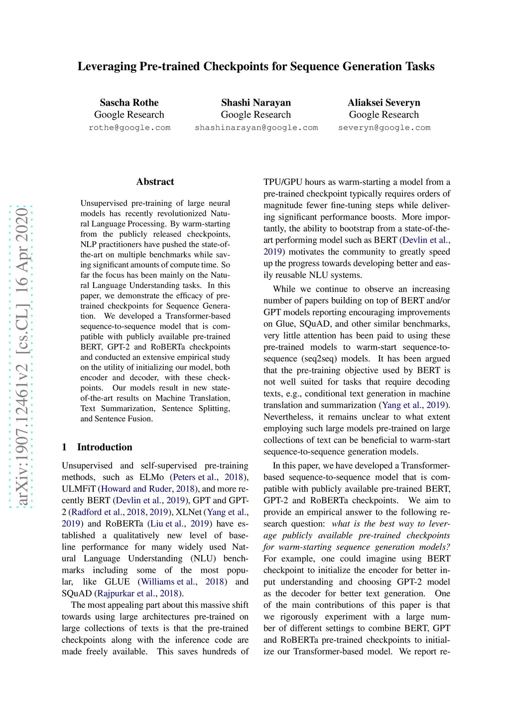 Unsupervised pre-training of large neural models has recently revolutionized Natural Language Processing. By warm-starting from the publicly released checkpoints, NLP practitioners have pushed the state-of-the-art on multiple benchmarks while saving significant amounts of compute time. So far the focus has been mainly on the Natural Language Understanding tasks. In this paper, we demonstrate the efficacy of pre-trained checkpoints for Sequence Generation. We developed a Transformer-based sequence-to-sequence model that is compatible with publicly available pre-trained BERT, GPT-2 and RoBERTa checkpoints and conducted an extensive empirical study on the utility of initializing our model, both encoder and decoder, with these checkpoints. Our models result in new state-of-the-art results on Machine Translation, Text Summarization, Sentence Splitting, and Sentence Fusion.