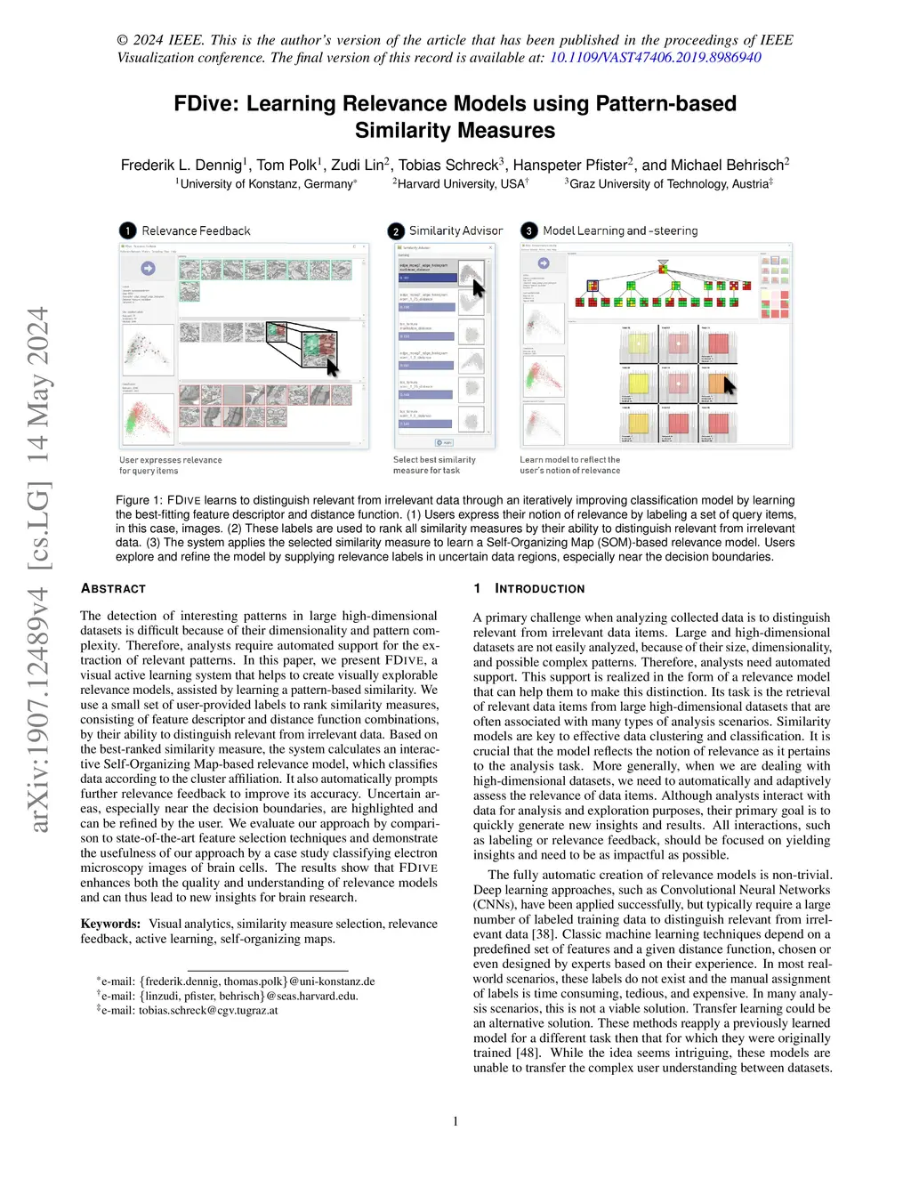 The detection of interesting patterns in large high-dimensional datasets is difficult because of their dimensionality and pattern complexity. Therefore, analysts require automated support for the extraction of relevant patterns. In this paper, we present FDive, a visual active learning system that helps to create visually explorable relevance models, assisted by learning a pattern-based similarity. We use a small set of user-provided labels to rank similarity measures, consisting of feature descriptor and distance function combinations, by their ability to distinguish relevant from irrelevant data. Based on the best-ranked similarity measure, the system calculates an interactive Self-Organizing Map-based relevance model, which classifies data according to the cluster affiliation. It also automatically prompts further relevance feedback to improve its accuracy. Uncertain areas, especially near the decision boundaries, are highlighted and can be refined by the user. We evaluate our approach by comparison to state-of-the-art feature selection techniques and demonstrate the usefulness of our approach by a case study classifying electron microscopy images of brain cells. The results show that FDive enhances both the quality and understanding of relevance models and can thus lead to new insights for brain research.