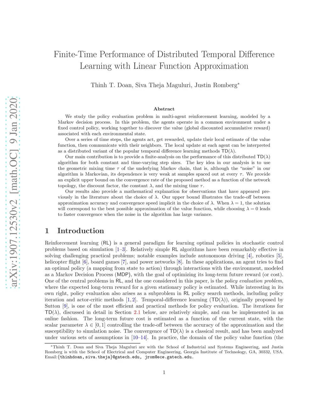 We study the policy evaluation problem in multi-agent reinforcement learning, modeled by a Markov decision process. In this problem, the agents operate in a common environment under a fixed control policy, working together to discover the value (global discounted accumulative reward) associated with each environmental state. Over a series of time steps, the agents act, get rewarded, update their local estimate of the value function, then communicate with their neighbors. The local update at each agent can be interpreted as a distributed variant of the popular temporal difference learning methods {\sf TD}$ (\lambda)(\lambda)$ algorithm for both constant and time-varying step sizes. The key idea in our analysis is to use the geometric mixing time of the underlying Markov chain, that is, although the "noise" in our algorithm is Markovian, its dependence is very weak at samples spaced out at every . We provide an explicit upper bound on the convergence rate of the proposed method as a function of the network topology, the discount factor, the constant , and the mixing time . Our results also provide a mathematical explanation for observations that have appeared previously in the literature about the choice of . Our upper bound illustrates the trade-off between approximation accuracy and convergence speed implicit in the choice of . When , the solution will correspond to the best possible approximation of the value function, while choosing leads to faster convergence when the noise in the algorithm has large variance.