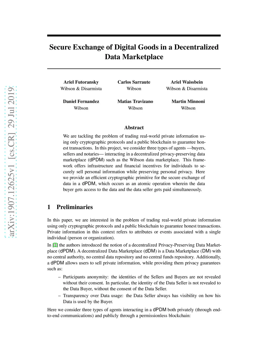 We are tackling the problem of trading real-world private information using only cryptographic protocols and a public blockchain to guarantee honest transactions. In this project, we consider three types of agents --buyers, sellers and notaries-- interacting in a decentralized privacy-preserving data marketplace (dPDM) such as the Wibson data marketplace. This framework offers infrastructure and financial incentives for individuals to securely sell personal information while preserving personal privacy. Here we provide an efficient cryptographic primitive for the secure exchange of data in a dPDM, which occurs as an atomic operation wherein the data buyer gets access to the data and the data seller gets paid simultaneously.
