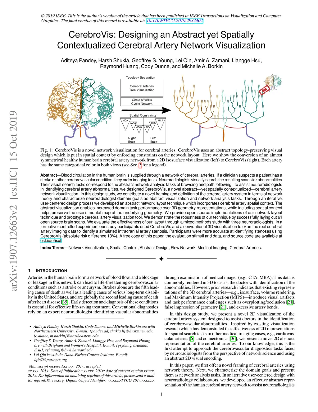Blood circulation in the human brain is supplied through a network of cerebral arteries. If a clinician suspects a patient has a stroke or other cerebrovascular condition they order imaging tests. Neuroradiologists visually search the resulting scans for abnormalities. Their visual search tasks correspond to the abstract network analysis tasks of browsing and path following. To assist neuroradiologists in identifying cerebral artery abnormalities we designed CerebroVis, a novel abstract---yet spatially contextualized---cerebral artery network visualization. In this design study, we contribute a novel framing and definition of the cerebral artery system in terms of network theory and characterize neuroradiologist domain goals as abstract visualization and network analysis tasks. Through an iterative, user-centered design process we developed an abstract network layout technique which incorporates cerebral artery spatial context. The abstract visualization enables increased domain task performance over 3D geometry representations, while including spatial context helps preserve the user's mental map of the underlying geometry. We provide open source implementations of our network layout technique and prototype cerebral artery visualization tool. We demonstrate the robustness of our technique by successfully laying out 61 open source brain scans. We evaluate the effectiveness of our layout through a mixed methods study with three neuroradiologists. In a formative controlled experiment our study participants used CerebroVis and a conventional 3D visualization to examine real cerebral artery imaging data and to identify a simulated intracranial artery stenosis. Participants were more accurate at identifying stenoses using CerebroVis (absolute risk difference 13%). A free copy of this paper, the evaluation stimuli and data, and source code are available at https://osf.io/e5sxt/.