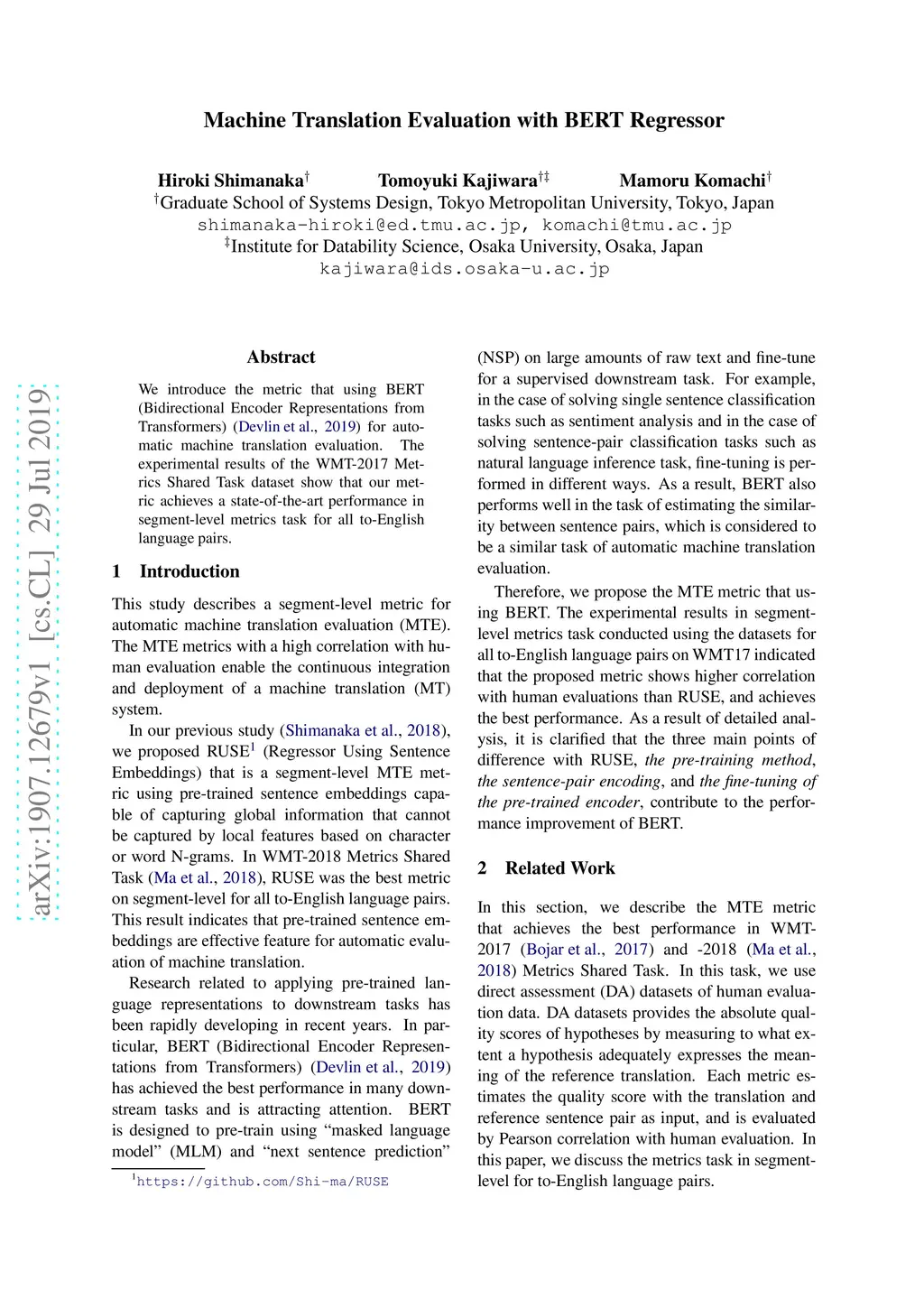 We introduce the metric using BERT (Bidirectional Encoder Representations from Transformers) (Devlin et al., 2019) for automatic machine translation evaluation. The experimental results of the WMT-2017 Metrics Shared Task dataset show that our metric achieves state-of-the-art performance in segment-level metrics task for all to-English language pairs.
