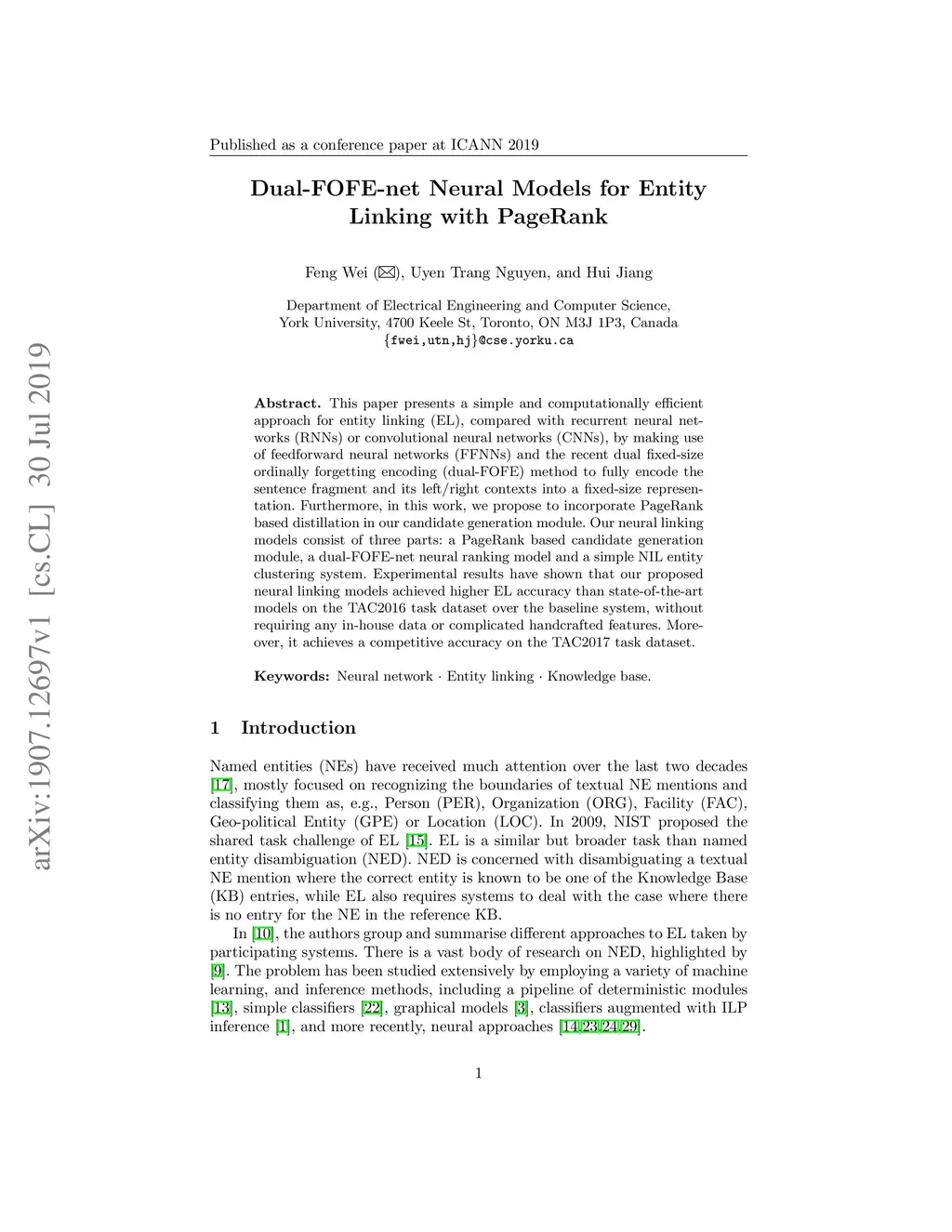 Dual-FOFE-net Neural Models for Entity Linking with PageRank