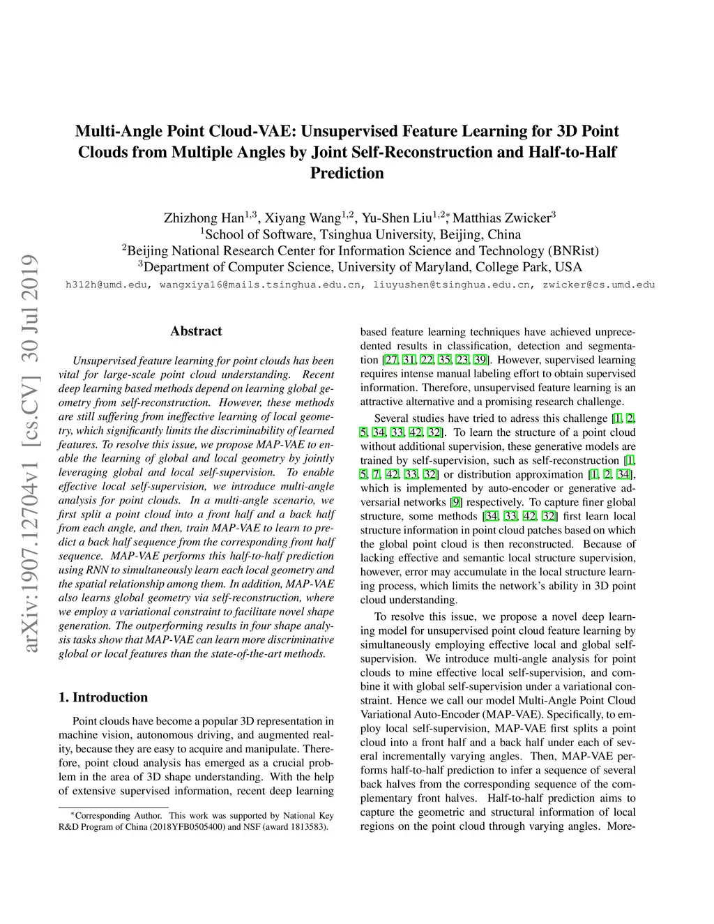 Unsupervised feature learning for point clouds has been vital for large-scale point cloud understanding. Recent deep learning based methods depend on learning global geometry from self-reconstruction. However, these methods are still suffering from ineffective learning of local geometry, which significantly limits the discriminability of learned features. To resolve this issue, we propose MAP-VAE to enable the learning of global and local geometry by jointly leveraging global and local self-supervision. To enable effective local self-supervision, we introduce multi-angle analysis for point clouds. In a multi-angle scenario, we first split a point cloud into a front half and a back half from each angle, and then, train MAP-VAE to learn to predict a back half sequence from the corresponding front half sequence. MAP-VAE performs this half-to-half prediction using RNN to simultaneously learn each local geometry and the spatial relationship among them. In addition, MAP-VAE also learns global geometry via self-reconstruction, where we employ a variational constraint to facilitate novel shape generation. The outperforming results in four shape analysis tasks show that MAP-VAE can learn more discriminative global or local features than the state-of-the-art methods.