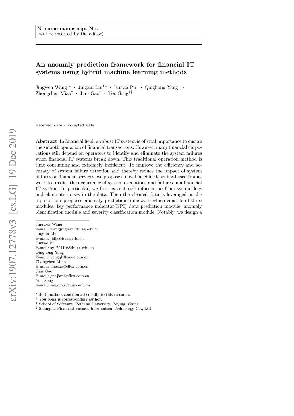 An anomaly prediction framework for financial IT systems using hybrid