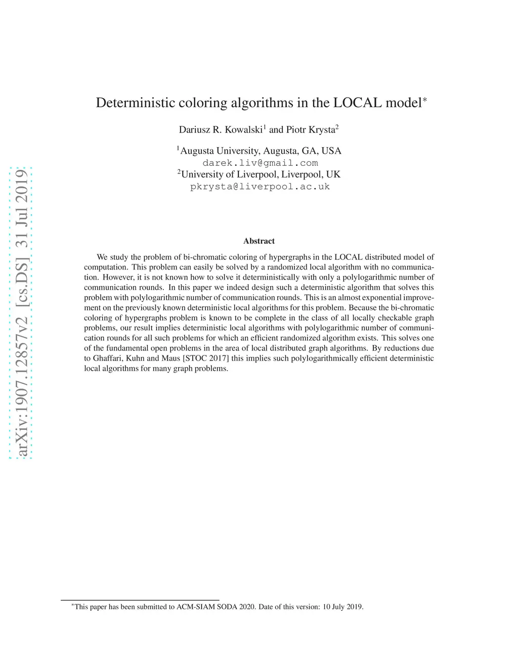 We study the problem of bi-chromatic coloring of hypergraphs in the LOCAL distributed model of computation. This problem can easily be solved by a randomized local algorithm with no communication. However, it is not known how to solve it deterministically with only a polylogarithmic number of communication rounds. In this paper we indeed design such a deterministic algorithm that solves this problem with polylogarithmic number of communication rounds. This is an almost exponential improvement on the previously known deterministic local algorithms for this problem. Because the bi-chromatic coloring of hypergraphs problem is known to be complete in the class of all locally checkable graph problems, our result implies deterministic local algorithms with polylogarithmic number of communication rounds for all such problems for which an efficient randomized algorithm exists. This solves one of the fundamental open problems in the area of local distributed graph algorithms. By reductions due to Ghaffari, Kuhn and Maus [STOC 2017] this implies such polylogarithmically efficient deterministic local algorithms for many graph problems.