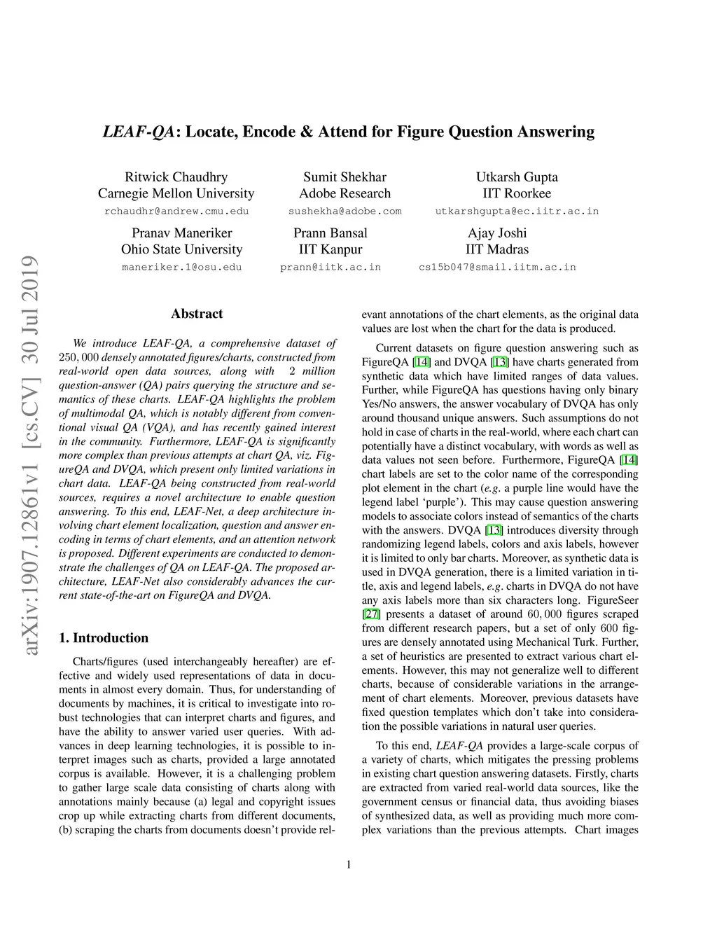 We introduce LEAF-QA, a comprehensive dataset of densely annotated figures/charts, constructed from real-world open data sources, along with ~2 million question-answer (QA) pairs querying the structure and semantics of these charts. LEAF-QA highlights the problem of multimodal QA, which is notably different from conventional visual QA (VQA), and has recently gained interest in the community. Furthermore, LEAF-QA is significantly more complex than previous attempts at chart QA, viz. FigureQA and DVQA, which present only limited variations in chart data. LEAF-QA being constructed from real-world sources, requires a novel architecture to enable question answering. To this end, LEAF-Net, a deep architecture involving chart element localization, question and answer encoding in terms of chart elements, and an attention network is proposed. Different experiments are conducted to demonstrate the challenges of QA on LEAF-QA. The proposed architecture, LEAF-Net also considerably advances the current state-of-the-art on FigureQA and DVQA.