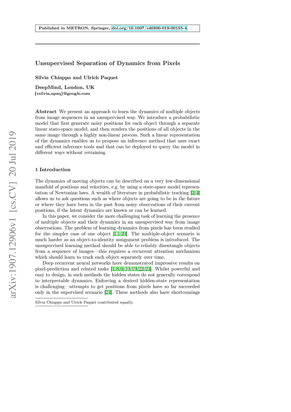 We present an approach to learn the dynamics of multiple objects from image sequences in an unsupervised way. We introduce a probabilistic model that first generate noisy positions for each object through a separate linear state-space model, and then renders the positions of all objects in the same image through a highly non-linear process. Such a linear representation of the dynamics enables us to propose an inference method that uses exact and efficient inference tools and that can be deployed to query the model in different ways without retraining.