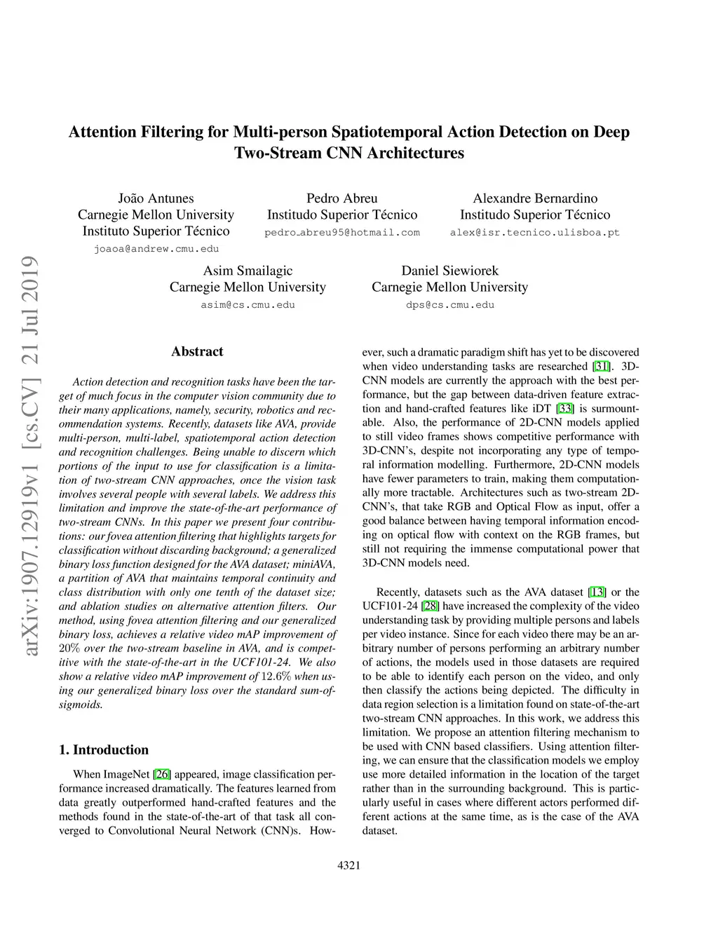 Action detection and recognition tasks have been the target of much focus in the computer vision community due to their many applications, namely, security, robotics and recommendation systems. Recently, datasets like AVA, provide multi-person, multi-label, spatiotemporal action detection and recognition challenges. Being unable to discern which portions of the input to use for classification is a limitation of two-stream CNN approaches, once the vision task involves several people with several labels. We address this limitation and improve the state-of-the-art performance of two-stream CNNs. In this paper we present four contributions: our fovea attention filtering that highlights targets for classification without discarding background; a generalized binary loss function designed for the AVA dataset; miniAVA, a partition of AVA that maintains temporal continuity and class distribution with only one tenth of the dataset size; and ablation studies on alternative attention filters. Our method, using fovea attention filtering and our generalized binary loss, achieves a relative video mAP improvement of 20% over the two-stream baseline in AVA, and is competitive with the state-of-the-art in the UCF101-24. We also show a relative video mAP improvement of 12.6% when using our generalized binary loss over the standard sum-of-sigmoids.