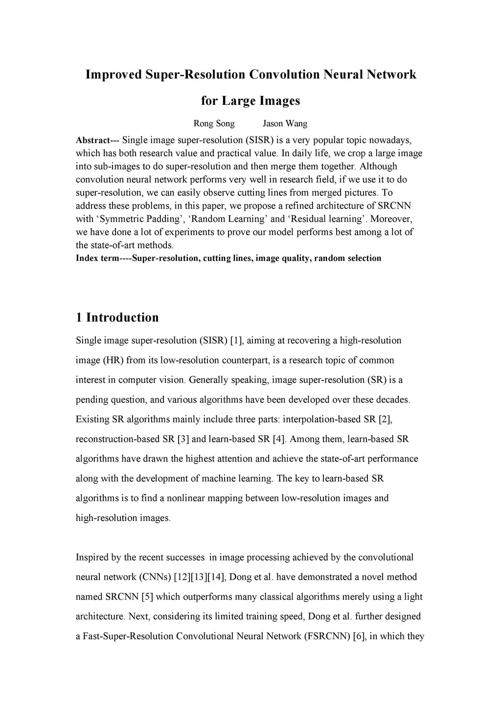 Single image super-resolution (SISR) is a very popular topic nowadays, which has both research value and practical value. In daily life, we crop a large image into sub-images to do super-resolution and then merge them together. Although convolution neural network performs very well in the research field, if we use it to do super-resolution, we can easily observe cutting lines from merged pictures. To address these problems, in this paper, we propose a refined architecture of SRCNN with 'Symmetric padding', 'Random learning' and 'Residual learning'. Moreover, we have done a lot of experiments to prove our model performs best among a lot of the state-of-art methods.