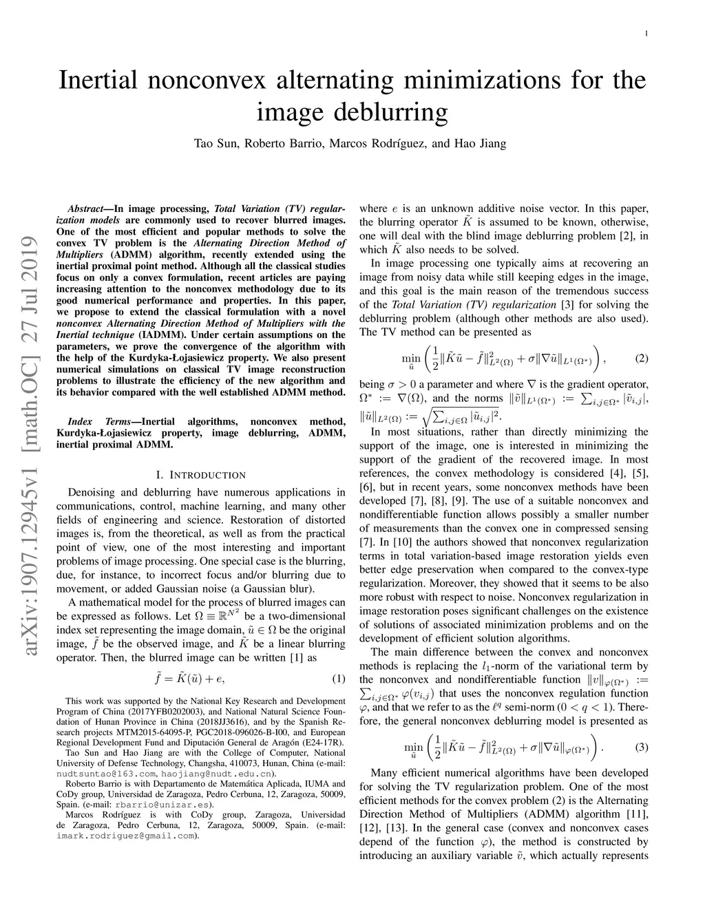 In image processing, Total Variation (TV) regularization models are commonly used to recover blurred images. One of the most efficient and popular methods to solve the convex TV problem is the Alternating Direction Method of Multipliers (ADMM) algorithm, recently extended using the inertial proximal point method. Although all the classical studies focus on only a convex formulation, recent articles are paying increasing attention to the nonconvex methodology due to its good numerical performance and properties. In this paper, we propose to extend the classical formulation with a novel nonconvex Alternating Direction Method of Multipliers with the Inertial technique (IADMM). Under certain assumptions on the parameters, we prove the convergence of the algorithm with the help of the Kurdyka-{\L}ojasiewicz property. We also present numerical simulations on classical TV image reconstruction problems to illustrate the efficiency of the new algorithm and its behavior compared with the well established ADMM method.