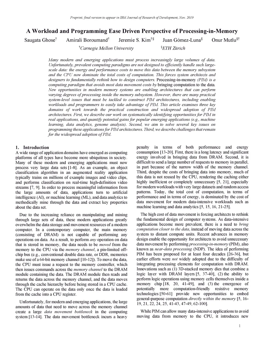 Many modern and emerging applications must process increasingly large volumes of data. Unfortunately, prevalent computing paradigms are not designed to efficiently handle such large-scale data: the energy and performance costs to move this data between the memory subsystem and the CPU now dominate the total costs of computation. This forces system architects and designers to fundamentally rethink how to design computers. Processing-in-memory (PIM) is a computing paradigm that avoids most data movement costs by bringing computation to the data. New opportunities in modern memory systems are enabling architectures that can perform varying degrees of processing inside the memory subsystem. However, there are many practical system-level issues that must be tackled to construct PIM architectures, including enabling workloads and programmers to easily take advantage of PIM. This article examines three key domains of work towards the practical construction and widespread adoption of PIM architectures. First, we describe our work on systematically identifying opportunities for PIM in real applications, and quantify potential gains for popular emerging applications (e.g., machine learning, data analytics, genome analysis). Second, we aim to solve several key issues on programming these applications for PIM architectures. Third, we describe challenges that remain for the widespread adoption of PIM.