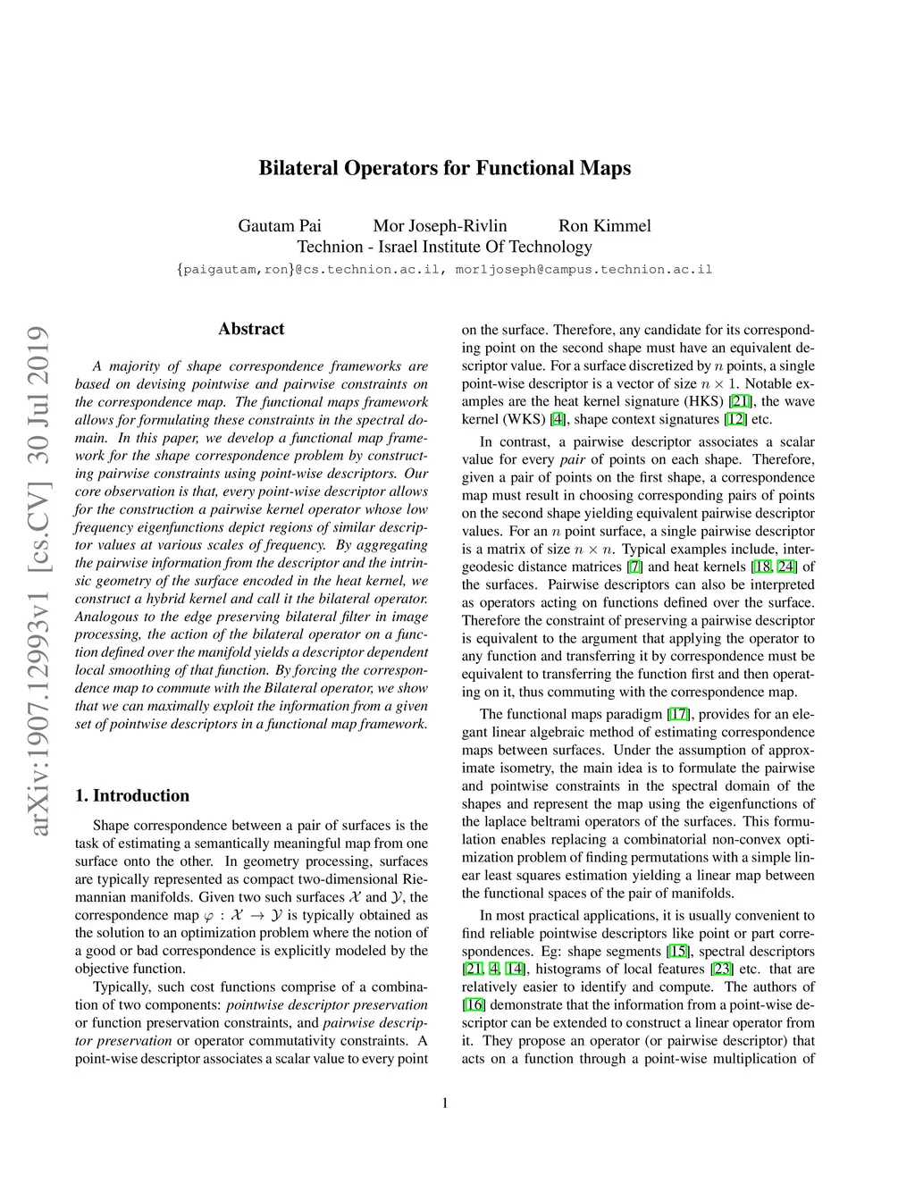 A majority of shape correspondence frameworks are based on devising pointwise and pairwise constraints on the correspondence map. The functional maps framework allows for formulating these constraints in the spectral domain. In this paper, we develop a functional map framework for the shape correspondence problem by constructing pairwise constraints using point-wise descriptors. Our core observation is that, every point-wise descriptor allows for the construction a pairwise kernel operator whose low frequency eigenfunctions depict regions of similar descriptor values at various scales of frequency. By aggregating the pairwise information from the descriptor and the intrinsic geometry of the surface encoded in the heat kernel, we construct a hybrid kernel and call it the bilateral operator. Analogous to the edge preserving bilateral filter in image processing, the action of the bilateral operator on a function defined over the manifold yields a descriptor dependent local smoothing of that function. By forcing the correspondence map to commute with the Bilateral operator, we show that we can maximally exploit the information from a given set of pointwise descriptors in a functional map framework.