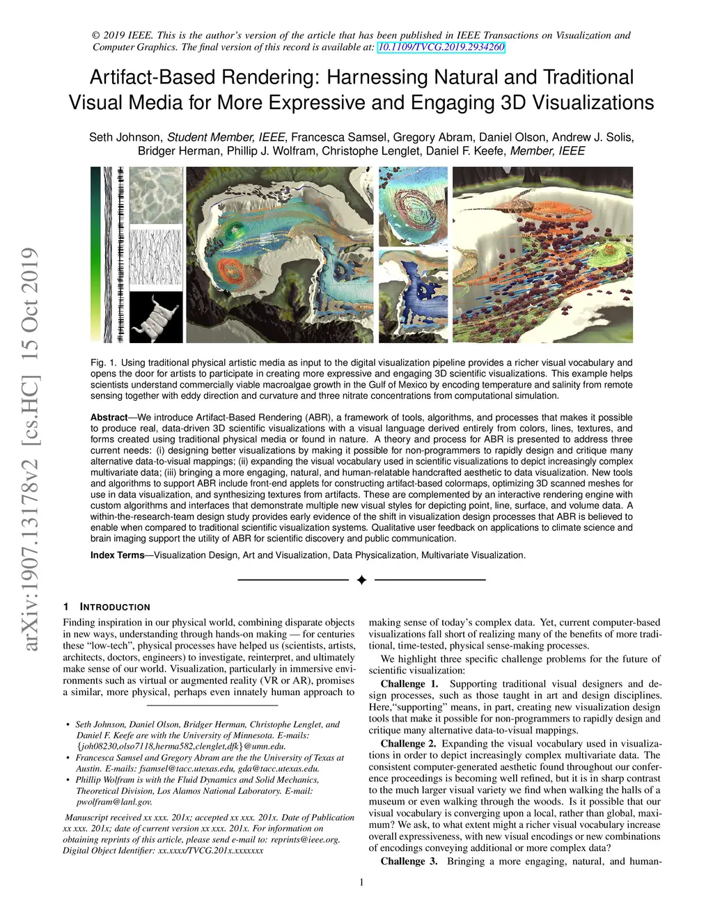 We introduce Artifact-Based Rendering (ABR), a framework of tools, algorithms, and processes that makes it possible to produce real, data-driven 3D scientific visualizations with a visual language derived entirely from colors, lines, textures, and forms created using traditional physical media or found in nature. A theory and process for ABR is presented to address three current needs: (i) designing better visualizations by making it possible for non-programmers to rapidly design and critique many alternative data-to-visual mappings; (ii) expanding the visual vocabulary used in scientific visualizations to depict increasingly complex multivariate data; (iii) bringing a more engaging, natural, and human-relatable handcrafted aesthetic to data visualization. New tools and algorithms to support ABR include front-end applets for constructing artifact-based colormaps, optimizing 3D scanned meshes for use in data visualization, and synthesizing textures from artifacts. These are complemented by an interactive rendering engine with custom algorithms and interfaces that demonstrate multiple new visual styles for depicting point, line, surface, and volume data. A within-the-research-team design study provides early evidence of the shift in visualization design processes that ABR is believed to enable when compared to traditional scientific visualization systems. Qualitative user feedback on applications to climate science and brain imaging support the utility of ABR for scientific discovery and public communication.