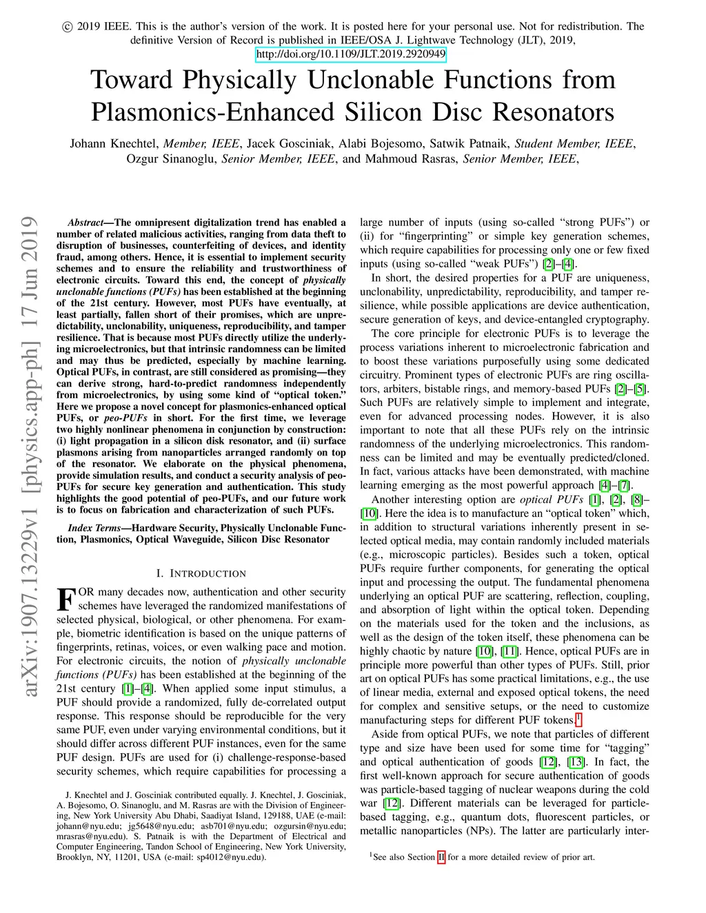 The omnipresent digitalization trend has enabled a number of related malicious activities, ranging from data theft to disruption of businesses, counterfeiting of devices, and identity fraud, among others. Hence, it is essential to implement security schemes and to ensure the reliability and trustworthiness of electronic circuits. Toward this end, the concept of physically unclonable functions (PUFs) has been established at the beginning of the 21st century. However, most PUFs have eventually, at least partially, fallen short of their promises, which are unpredictability, unclonability, uniqueness, reproducibility, and tamper resilience. That is because most PUFs directly utilize the underlying microelectronics, but that intrinsic randomness can be limited and may thus be predicted, especially by machine learning. Optical PUFs, in contrast, are still considered as promising---they can derive strong, hard-to-predict randomness independently from microelectronics, by using some kind of "optical token." Here we propose a novel concept for plasmonics-enhanced optical PUFs, or peo-PUFs in short. For the first time, we leverage two highly nonlinear phenomena in conjunction by construction: (i) light propagation in a silicon disk resonator, and (ii) surface plasmons arising from nanoparticles arranged randomly on top of the resonator. We elaborate on the physical phenomena, provide simulation results, and conduct a security analysis of peo- PUFs for secure key generation and authentication. This study highlights the good potential of peo-PUFs, and our future work is to focus on fabrication and characterization of such PUFs.