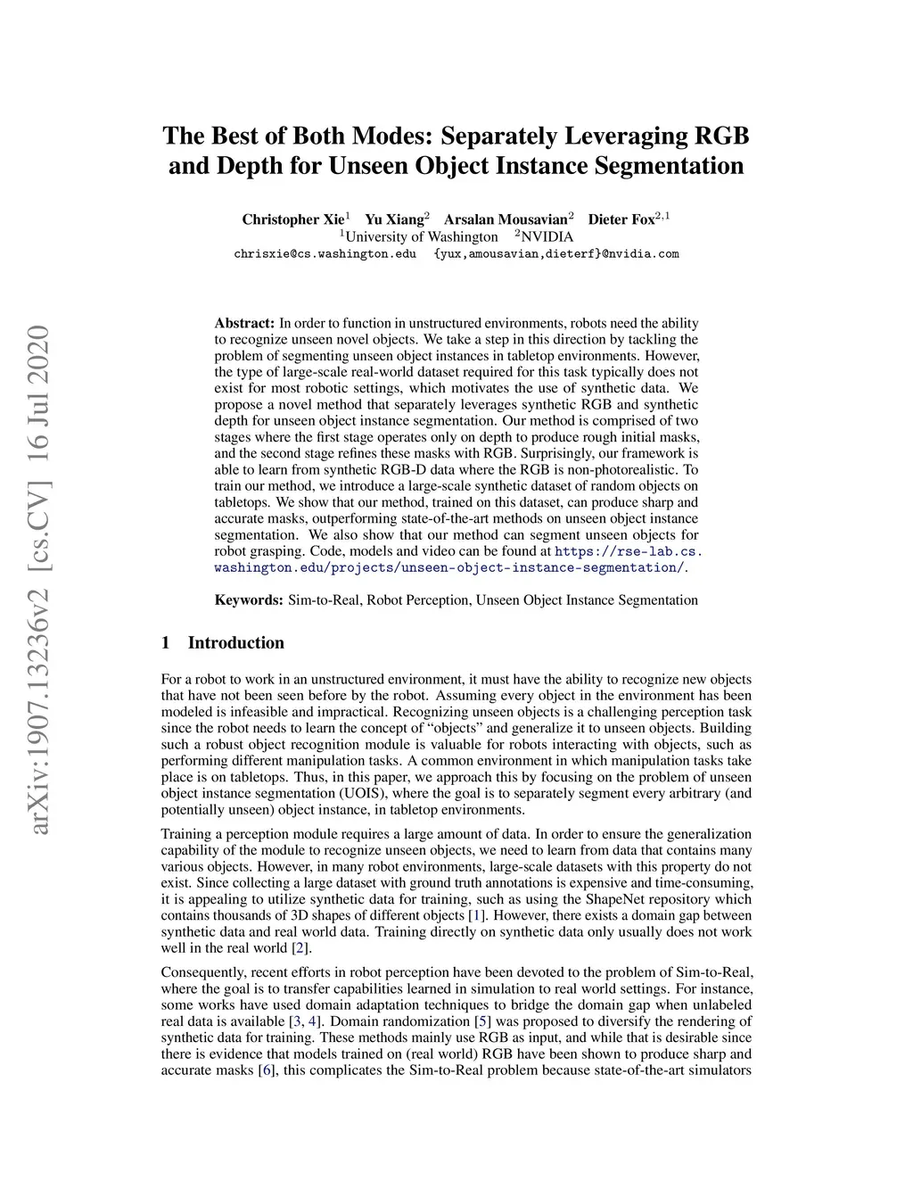 In order to function in unstructured environments, robots need the ability to recognize unseen novel objects. We take a step in this direction by tackling the problem of segmenting unseen object instances in tabletop environments. However, the type of large-scale real-world dataset required for this task typically does not exist for most robotic settings, which motivates the use of synthetic data. We propose a novel method that separately leverages synthetic RGB and synthetic depth for unseen object instance segmentation. Our method is comprised of two stages where the first stage operates only on depth to produce rough initial masks, and the second stage refines these masks with RGB. Surprisingly, our framework is able to learn from synthetic RGB-D data where the RGB is non-photorealistic. To train our method, we introduce a large-scale synthetic dataset of random objects on tabletops. We show that our method, trained on this dataset, can produce sharp and accurate masks, outperforming state-of-the-art methods on unseen object instance segmentation. We also show that our method can segment unseen objects for robot grasping. Code, models and video can be found at https://rse-lab.cs.washington.edu/projects/unseen-object-instance-segmentation/.
