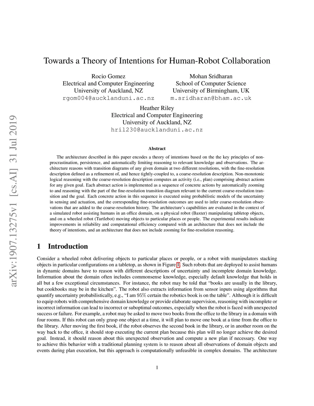 The architecture described in this paper encodes a theory of intentions based on the the key principles of non-procrastination, persistence, and automatically limiting reasoning to relevant knowledge and observations. The architecture reasons with transition diagrams of any given domain at two different resolutions, with the fine-resolution description defined as a refinement of, and hence tightly-coupled to, a coarse-resolution description. Non-monotonic logical reasoning with the coarse-resolution description computes an activity (i.e., plan) comprising abstract actions for any given goal. Each abstract action is implemented as a sequence of concrete actions by automatically zooming to and reasoning with the part of the fine-resolution transition diagram relevant to the current coarse-resolution transition and the goal. Each concrete action in this sequence is executed using probabilistic models of the uncertainty in sensing and actuation, and the corresponding fine-resolution outcomes are used to infer coarse-resolution observations that are added to the coarse-resolution history. The architecture's capabilities are evaluated in the context of a simulated robot assisting humans in an office domain, on a physical robot (Baxter) manipulating tabletop objects, and on a wheeled robot (Turtlebot) moving objects to particular places or people. The experimental results indicate improvements in reliability and computational efficiency compared with an architecture that does not include the theory of intentions, and an architecture that does not include zooming for fine-resolution reasoning.