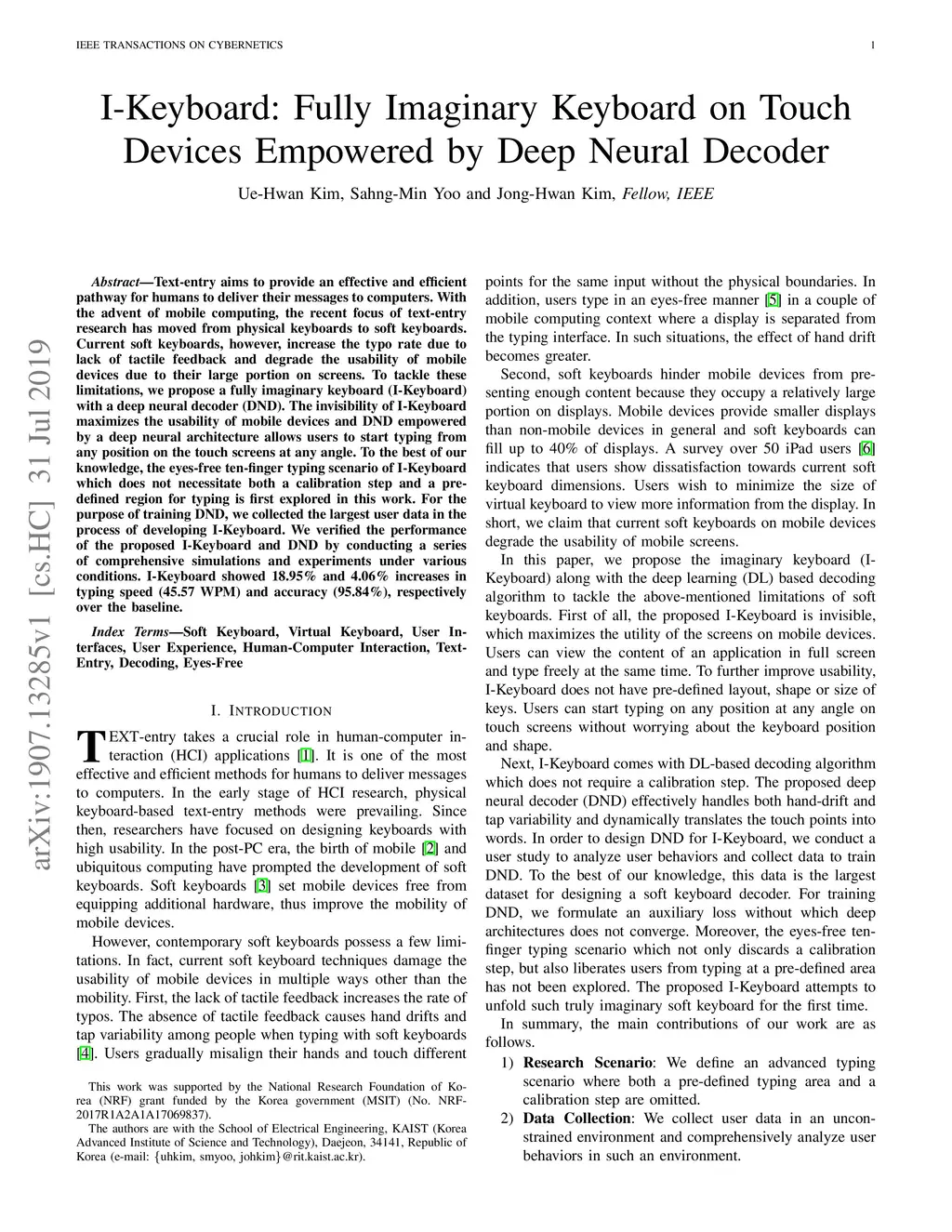 Text-entry aims to provide an effective and efficient pathway for humans to deliver their messages to computers. With the advent of mobile computing, the recent focus of text-entry research has moved from physical keyboards to soft keyboards. Current soft keyboards, however, increase the typo rate due to lack of tactile feedback and degrade the usability of mobile devices due to their large portion on screens. To tackle these limitations, we propose a fully imaginary keyboard (I-Keyboard) with a deep neural decoder (DND). The invisibility of I-Keyboard maximizes the usability of mobile devices and DND empowered by a deep neural architecture allows users to start typing from any position on the touch screens at any angle. To the best of our knowledge, the eyes-free ten-finger typing scenario of I-Keyboard which does not necessitate both a calibration step and a predefined region for typing is first explored in this work. For the purpose of training DND, we collected the largest user data in the process of developing I-Keyboard. We verified the performance of the proposed I-Keyboard and DND by conducting a series of comprehensive simulations and experiments under various conditions. I-Keyboard showed 18.95% and 4.06% increases in typing speed (45.57 WPM) and accuracy (95.84%), respectively over the baseline.