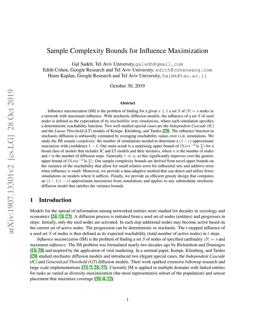 Influence maximization (IM) is the problem of finding for a given a set of nodes in a network with maximum influence. With stochastic diffusion models, the influence of a set of seed nodes is defined as the expectation of its reachability over simulations, where each simulation specifies a deterministic reachability function. Two well-studied special cases are the Independent Cascade (IC) and the Linear Threshold (LT) models of Kempe, Kleinberg, and Tardos. The influence function in stochastic diffusion is unbiasedly estimated by averaging reachability values over i.i.d. simulations. We study the IM sample complexity: the number of simulations needed to determine a -approximate maximizer with confidence . Our main result is a surprising upper bound of for a broad class of models that includes IC and LT models and their mixtures, where is the number of nodes and is the number of diffusion steps. Generally , so this significantly improves over the generic upper bound of . Our sample complexity bounds are derived from novel upper bounds on the variance of the reachability that allow for small relative error for influential sets and additive error when influence is small. Moreover, we provide a data-adaptive method that can detect and utilize fewer simulations on models where it suffices. Finally, we provide an efficient greedy design that computes an -approximate maximizer from simulations and applies to any submodular stochastic diffusion model that satisfies the variance bounds.