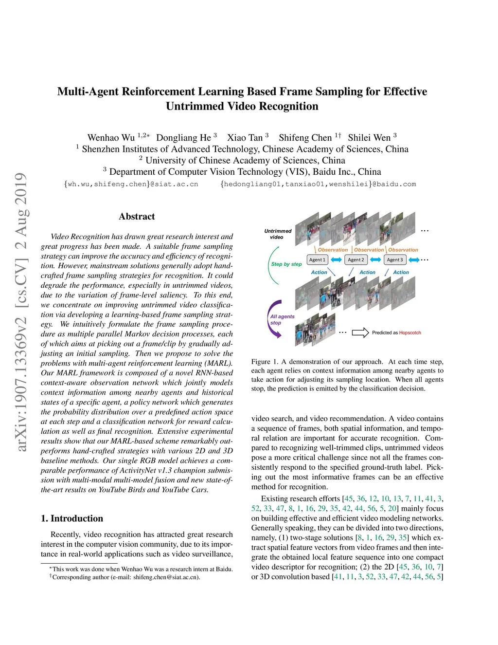 Video Recognition has drawn great research interest and great progress has been made. A suitable frame sampling strategy can improve the accuracy and efficiency of recognition. However, mainstream solutions generally adopt hand-crafted frame sampling strategies for recognition. It could degrade the performance, especially in untrimmed videos, due to the variation of frame-level saliency. To this end, we concentrate on improving untrimmed video classification via developing a learning-based frame sampling strategy. We intuitively formulate the frame sampling procedure as multiple parallel Markov decision processes, each of which aims at picking out a frame/clip by gradually adjusting an initial sampling. Then we propose to solve the problems with multi-agent reinforcement learning (MARL). Our MARL framework is composed of a novel RNN-based context-aware observation network which jointly models context information among nearby agents and historical states of a specific agent, a policy network which generates the probability distribution over a predefined action space at each step and a classification network for reward calculation as well as final recognition. Extensive experimental results show that our MARL-based scheme remarkably outperforms hand-crafted strategies with various 2D and 3D baseline methods. Our single RGB model achieves a comparable performance of ActivityNet v1.3 champion submission with multi-modal multi-model fusion and new state-of-the-art results on YouTube Birds and YouTube Cars.