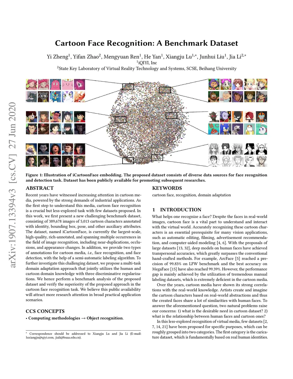 Recent years have witnessed increasing attention in cartoon media, powered by the strong demands of industrial applications. As the first step to understand this media, cartoon face recognition is a crucial but less-explored task with few datasets proposed. In this work, we first present a new challenging benchmark dataset, consisting of 389,678 images of 5,013 cartoon characters annotated with identity, bounding box, pose, and other auxiliary attributes. The dataset, named iCartoonFace, is currently the largest-scale, high-quality, richannotated, and spanning multiple occurrences in the field of image recognition, including near-duplications, occlusions, and appearance changes. In addition, we provide two types of annotations for cartoon media, i.e., face recognition, and face detection, with the help of a semi-automatic labeling algorithm. To further investigate this challenging dataset, we propose a multi-task domain adaptation approach that jointly utilizes the human and cartoon domain knowledge with three discriminative regularizations. We hence perform a benchmark analysis of the proposed dataset and verify the superiority of the proposed approach in the cartoon face recognition task. We believe this public availability will attract more research attention in broad practical application scenarios.