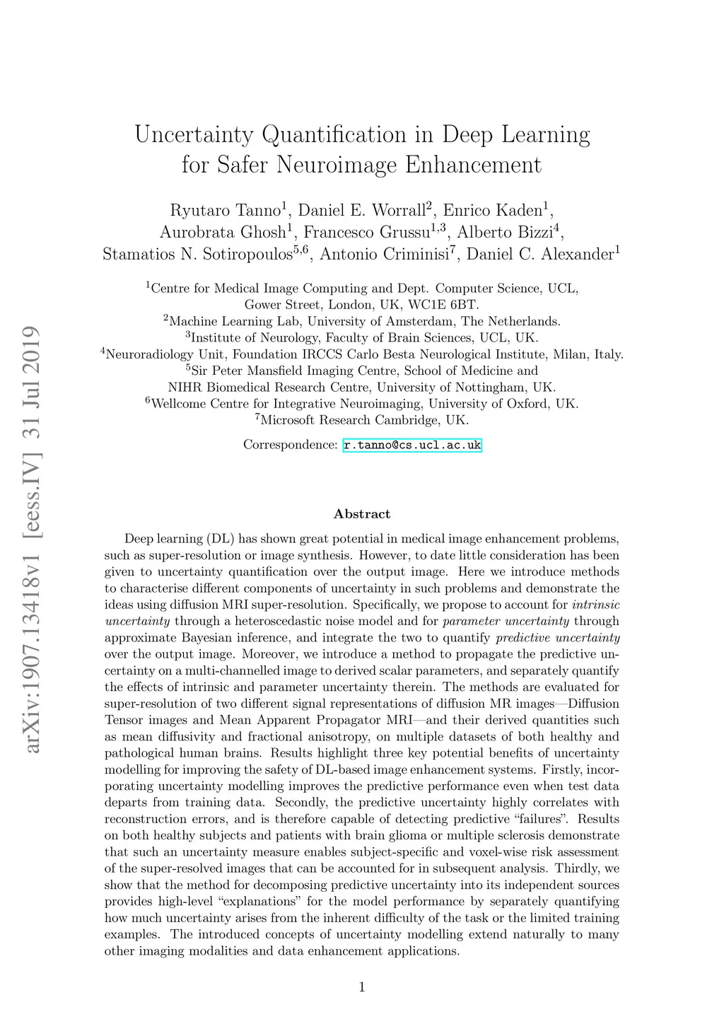 Deep learning (DL) has shown great potential in medical image enhancement problems, such as super-resolution or image synthesis. However, to date, little consideration has been given to uncertainty quantification over the output image. Here we introduce methods to characterise different components of uncertainty in such problems and demonstrate the ideas using diffusion MRI super-resolution. Specifically, we propose to account for uncertainty through a heteroscedastic noise model and for uncertainty through approximate Bayesian inference, and integrate the two to quantify uncertainty over the output image. Moreover, we introduce a method to propagate the predictive uncertainty on a multi-channelled image to derived scalar parameters, and separately quantify the effects of intrinsic and parameter uncertainty therein. The methods are evaluated for super-resolution of two different signal representations of diffusion MR images---DTIs and Mean Apparent Propagator MRI---and their derived quantities such as MD and FA, on multiple datasets of both healthy and pathological human brains. Results highlight three key benefits of uncertainty modelling for improving the safety of DL-based image enhancement systems. Firstly, incorporating uncertainty improves the predictive performance even when test data departs from training data. Secondly, the predictive uncertainty highly correlates with errors, and is therefore capable of detecting predictive "failures". Results demonstrate that such an uncertainty measure enables subject-specific and voxel-wise risk assessment of the output images. Thirdly, we show that the method for decomposing predictive uncertainty into its independent sources provides high-level "explanations" for the performance by quantifying how much uncertainty arises from the inherent difficulty of the task or the limited training examples.