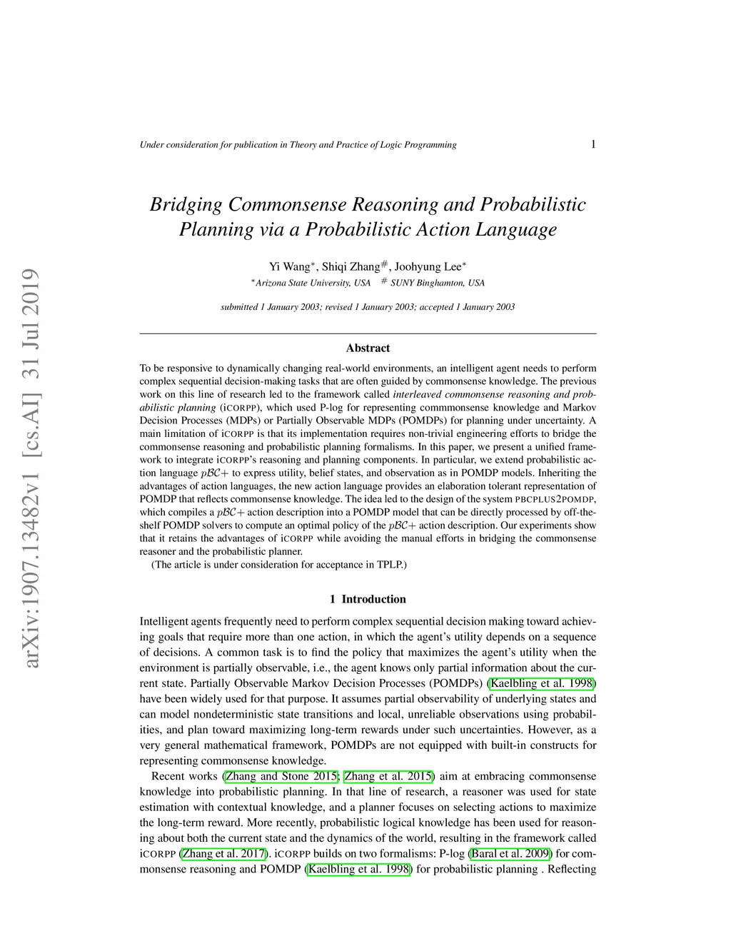 To be responsive to dynamically changing real-world environments, an intelligent agent needs to perform complex sequential decision-making tasks that are often guided by commonsense knowledge. The previous work on this line of research led to the framework called "interleaved commonsense reasoning and probabilistic planning" (icorpp), which used P-log for representing commmonsense knowledge and Markov Decision Processes (MDPs) or Partially Observable MDPs (POMDPs) for planning under uncertainty. A main limitation of icorpp is that its implementation requires non-trivial engineering efforts to bridge the commonsense reasoning and probabilistic planning formalisms. In this paper, we present a unified framework to integrate icorpp's reasoning and planning components. In particular, we extend probabilistic action language pBC+ to express utility, belief states, and observation as in POMDP models. Inheriting the advantages of action languages, the new action language provides an elaboration tolerant representation of POMDP that reflects commonsense knowledge. The idea led to the design of the system pbcplus2pomdp, which compiles a pBC+ action description into a POMDP model that can be directly processed by off-the-shelf POMDP solvers to compute an optimal policy of the pBC+ action description. Our experiments show that it retains the advantages of icorpp while avoiding the manual efforts in bridging the commonsense reasoner and the probabilistic planner.