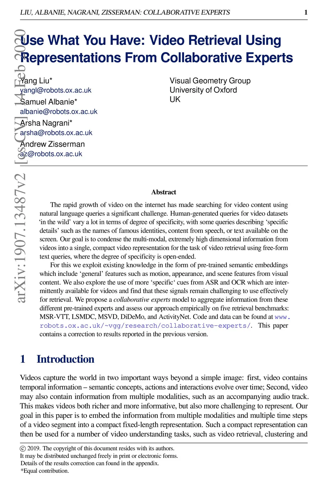 The rapid growth of video on the internet has made searching for video content using natural language queries a significant challenge. Human-generated queries for video datasets `in the wild' vary a lot in terms of degree of specificity, with some queries describing specific details such as the names of famous identities, content from speech, or text available on the screen. Our goal is to condense the multi-modal, extremely high dimensional information from videos into a single, compact video representation for the task of video retrieval using free-form text queries, where the degree of specificity is open-ended. For this we exploit existing knowledge in the form of pre-trained semantic embeddings which include 'general' features such as motion, appearance, and scene features from visual content. We also explore the use of more 'specific' cues from ASR and OCR which are intermittently available for videos and find that these signals remain challenging to use effectively for retrieval. We propose a collaborative experts model to aggregate information from these different pre-trained experts and assess our approach empirically on five retrieval benchmarks: MSR-VTT, LSMDC, MSVD, DiDeMo, and ActivityNet. Code and data can be found at www.robots.ox.ac.uk/~vgg/research/collaborative-experts/. This paper contains a correction to results reported in the previous version.