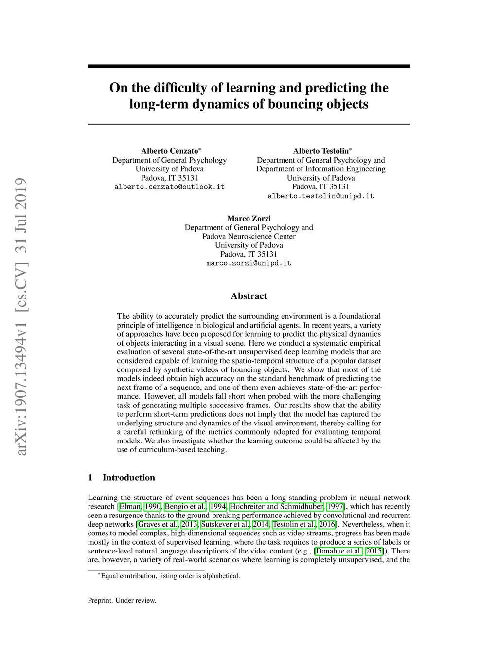 The ability to accurately predict the surrounding environment is a foundational principle of intelligence in biological and artificial agents. In recent years, a variety of approaches have been proposed for learning to predict the physical dynamics of objects interacting in a visual scene. Here we conduct a systematic empirical evaluation of several state-of-the-art unsupervised deep learning models that are considered capable of learning the spatio-temporal structure of a popular dataset composed by synthetic videos of bouncing objects. We show that most of the models indeed obtain high accuracy on the standard benchmark of predicting the next frame of a sequence, and one of them even achieves state-of-the-art performance. However, all models fall short when probed with the more challenging task of generating multiple successive frames. Our results show that the ability to perform short-term predictions does not imply that the model has captured the underlying structure and dynamics of the visual environment, thereby calling for a careful rethinking of the metrics commonly adopted for evaluating temporal models. We also investigate whether the learning outcome could be affected by the use of curriculum-based teaching.