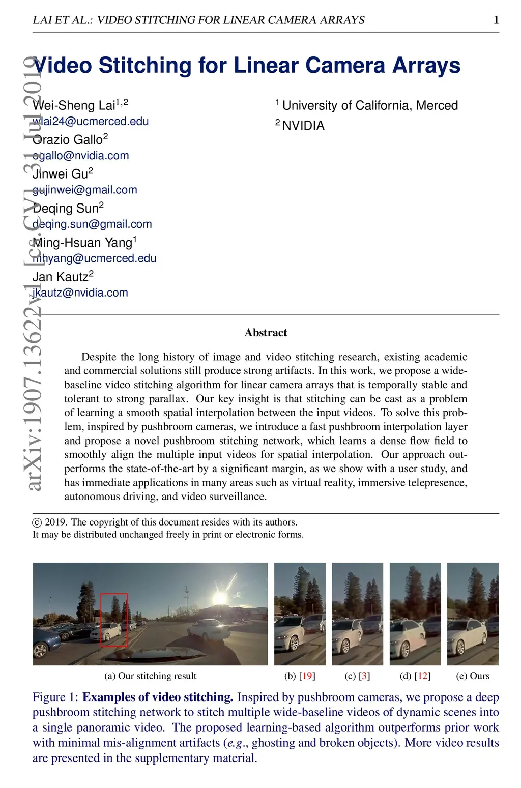 Despite the long history of image and video stitching research, existing academic and commercial solutions still produce strong artifacts. In this work, we propose a wide-baseline video stitching algorithm for linear camera arrays that is temporally stable and tolerant to strong parallax. Our key insight is that stitching can be cast as a problem of learning a smooth spatial interpolation between the input videos. To solve this problem, inspired by pushbroom cameras, we introduce a fast pushbroom interpolation layer and propose a novel pushbroom stitching network, which learns a dense flow field to smoothly align the multiple input videos for spatial interpolation. Our approach outperforms the state-of-the-art by a significant margin, as we show with a user study, and has immediate applications in many areas such as virtual reality, immersive telepresence, autonomous driving, and video surveillance.