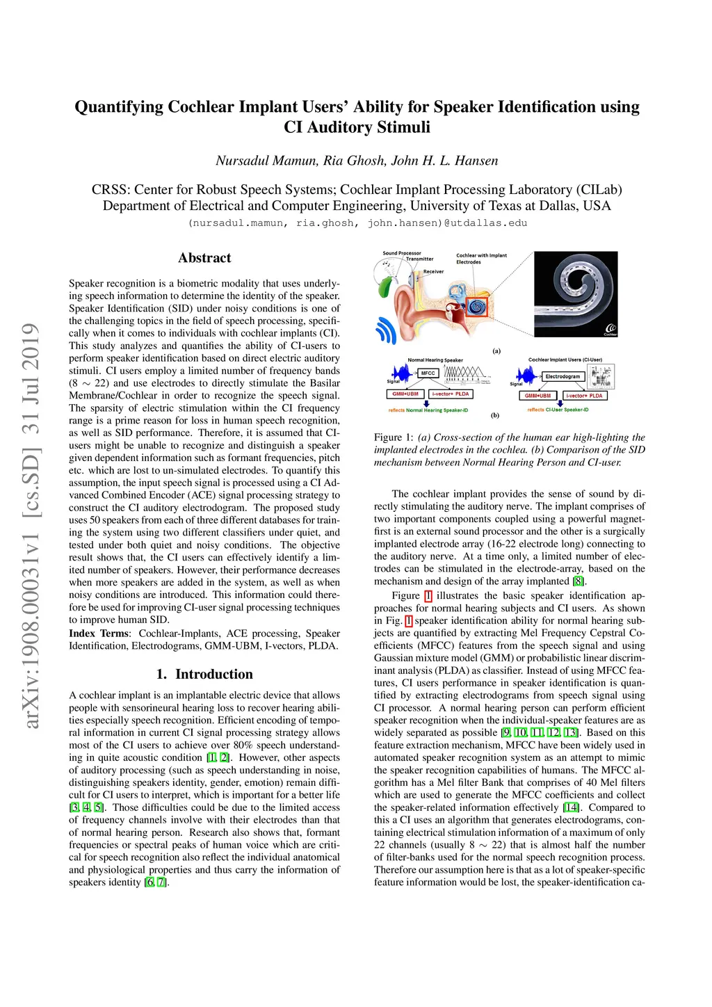 Speaker recognition is a biometric modality that uses underlying speech information to determine the identity of the speaker. Speaker Identification (SID) under noisy conditions is one of the challenging topics in the field of speech processing, specifically when it comes to individuals with cochlear implants (CI). This study analyzes and quantifies the ability of CI-users to perform speaker identification based on direct electric auditory stimuli. CI users employ a limited number of frequency bands (8 to 22) and use electrodes to directly stimulate the Basilar Membrane/Cochlear in order to recognize the speech signal. The sparsity of electric stimulation within the CI frequency range is a prime reason for loss in human speech recognition, as well as SID performance. Therefore, it is assumed that CI-users might be unable to recognize and distinguish a speaker given dependent information such as formant frequencies, pitch etc. which are lost to un-simulated electrodes. To quantify this assumption, the input speech signal is processed using a CI Advanced Combined Encoder (ACE) signal processing strategy to construct the CI auditory electrodogram. The proposed study uses 50 speakers from each of three different databases for training the system using two different classifiers under quiet, and tested under both quiet and noisy conditions. The objective result shows that, the CI users can effectively identify a limited number of speakers. However, their performance decreases when more speakers are added in the system, as well as when noisy conditions are introduced. This information could therefore be used for improving CI-user signal processing techniques to improve human SID.