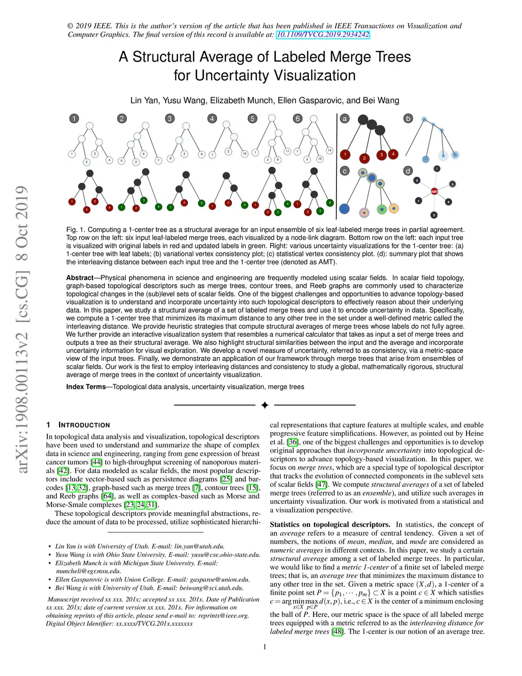 Physical phenomena in science and engineering are frequently modeled using scalar fields. In scalar field topology, graph-based topological descriptors such as merge trees, contour trees, and Reeb graphs are commonly used to characterize topological changes in the (sub)level sets of scalar fields. One of the biggest challenges and opportunities to advance topology-based visualization is to understand and incorporate uncertainty into such topological descriptors to effectively reason about their underlying data. In this paper, we study a structural average of a set of labeled merge trees and use it to encode uncertainty in data. Specifically, we compute a 1-center tree that minimizes its maximum distance to any other tree in the set under a well-defined metric called the interleaving distance. We provide heuristic strategies that compute structural averages of merge trees whose labels do not fully agree. We further provide an interactive visualization system that resembles a numerical calculator that takes as input a set of merge trees and outputs a tree as their structural average. We also highlight structural similarities between the input and the average and incorporate uncertainty information for visual exploration. We develop a novel measure of uncertainty, referred to as consistency, via a metric-space view of the input trees. Finally, we demonstrate an application of our framework through merge trees that arise from ensembles of scalar fields. Our work is the first to employ interleaving distances and consistency to study a global, mathematically rigorous, structural average of merge trees in the context of uncertainty visualization.