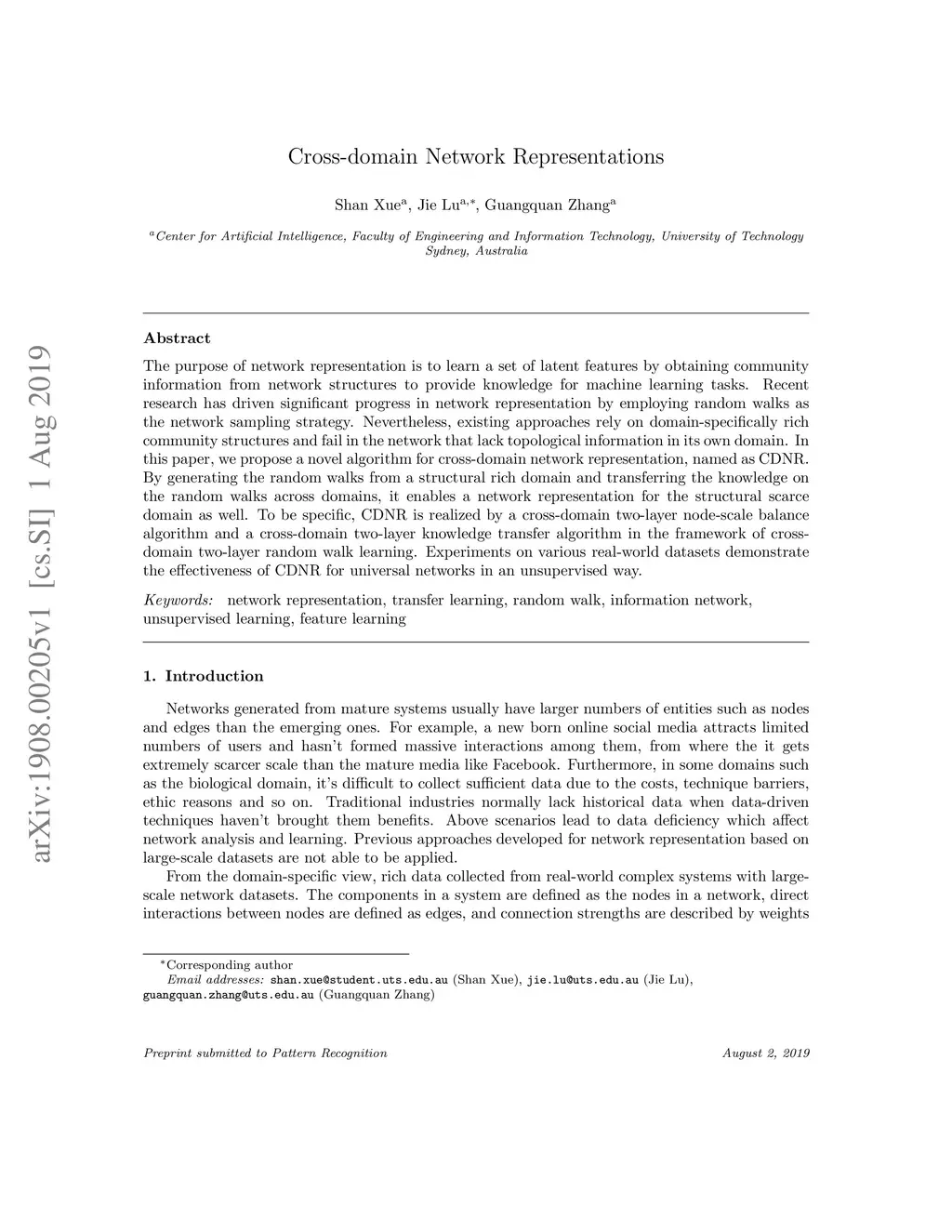 The purpose of network representation is to learn a set of latent features by obtaining community information from network structures to provide knowledge for machine learning tasks. Recent research has driven significant progress in network representation by employing random walks as the network sampling strategy. Nevertheless, existing approaches rely on domain-specifically rich community structures and fail in the network that lack topological information in its own domain. In this paper, we propose a novel algorithm for cross-domain network representation, named as CDNR. By generating the random walks from a structural rich domain and transferring the knowledge on the random walks across domains, it enables a network representation for the structural scarce domain as well. To be specific, CDNR is realized by a cross-domain two-layer node-scale balance algorithm and a cross-domain two-layer knowledge transfer algorithm in the framework of cross-domain two-layer random walk learning. Experiments on various real-world datasets demonstrate the effectiveness of CDNR for universal networks in an unsupervised way.