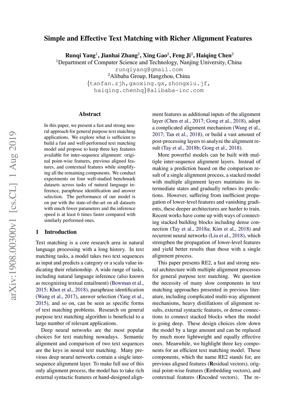 In this paper, we present a fast and strong neural approach for general purpose text matching applications. We explore what is sufficient to build a fast and well-performed text matching model and propose to keep three key features available for inter-sequence alignment: original point-wise features, previous aligned features, and contextual features while simplifying all the remaining components. We conduct experiments on four well-studied benchmark datasets across tasks of natural language inference, paraphrase identification and answer selection. The performance of our model is on par with the state-of-the-art on all datasets with much fewer parameters and the inference speed is at least 6 times faster compared with similarly performed ones.