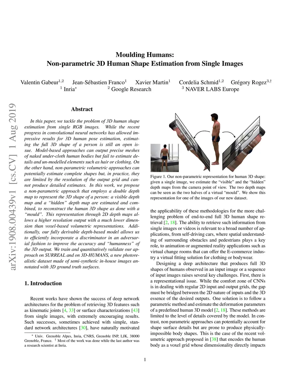 In this paper, we tackle the problem of 3D human shape estimation from single RGB images. While the recent progress in convolutional neural networks has allowed impressive results for 3D human pose estimation, estimating the full 3D shape of a person is still an open issue. Model-based approaches can output precise meshes of naked under-cloth human bodies but fail to estimate details and un-modelled elements such as hair or clothing. On the other hand, non-parametric volumetric approaches can potentially estimate complete shapes but, in practice, they are limited by the resolution of the output grid and cannot produce detailed estimates. In this work, we propose a non-parametric approach that employs a double depth map to represent the 3D shape of a person: a visible depth map and a "hidden" depth map are estimated and combined, to reconstruct the human 3D shape as done with a "mould". This representation through 2D depth maps allows a higher resolution output with a much lower dimension than voxel-based volumetric representations. Additionally, our fully derivable depth-based model allows us to efficiently incorporate a discriminator in an adversarial fashion to improve the accuracy and "humanness" of the 3D output. We train and quantitatively validate our approach on SURREAL and on 3D-HUMANS, a new photorealistic dataset made of semi-synthetic in-house videos annotated with 3D ground truth surfaces.