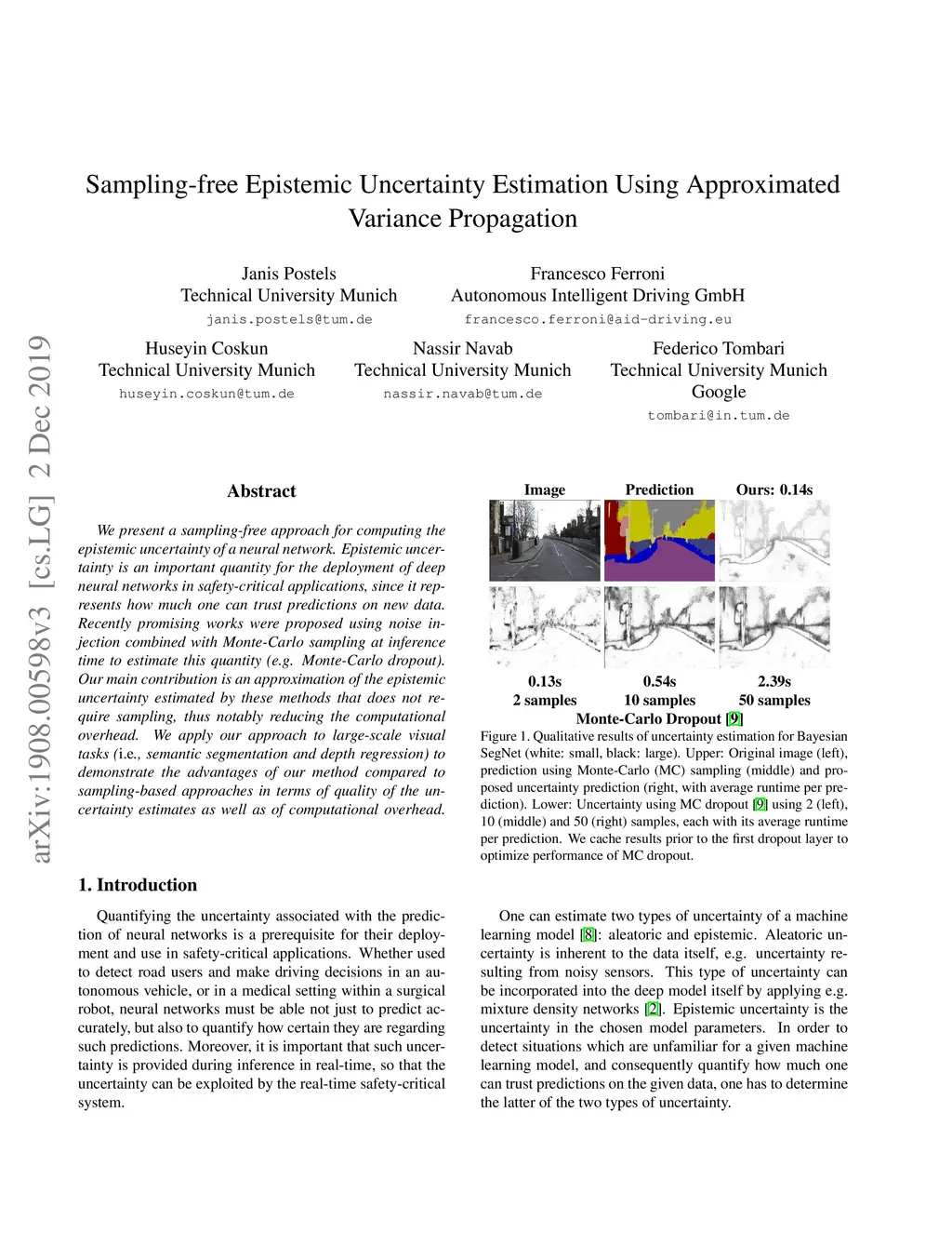 We present a sampling-free approach for computing the epistemic uncertainty of a neural network. Epistemic uncertainty is an important quantity for the deployment of deep neural networks in safety-critical applications, since it represents how much one can trust predictions on new data. Recently promising works were proposed using noise injection combined with Monte-Carlo sampling at inference time to estimate this quantity (e.g. Monte-Carlo dropout). Our main contribution is an approximation of the epistemic uncertainty estimated by these methods that does not require sampling, thus notably reducing the computational overhead. We apply our approach to large-scale visual tasks (i.e., semantic segmentation and depth regression) to demonstrate the advantages of our method compared to sampling-based approaches in terms of quality of the uncertainty estimates as well as of computational overhead.