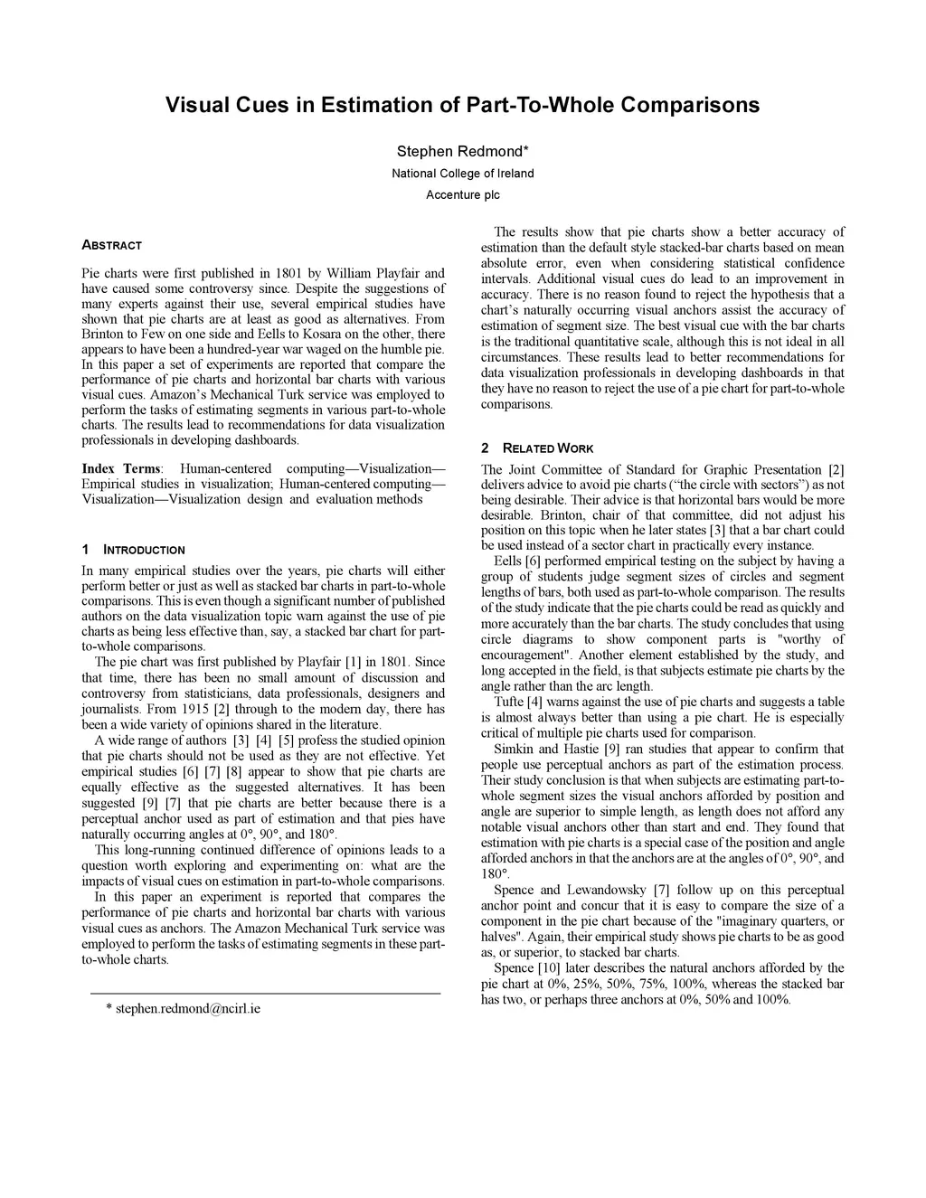 Pie charts were first published in 1801 by William Playfair and have caused some controversy since. Despite the suggestions of many experts against their use, several empirical studies have shown that pie charts are at least as good as alternatives. From Brinton to Few on one side and Eells to Kosara on the other, there appears to have been a hundred-year war waged on the humble pie. In this paper a set of experiments are reported that compare the performance of pie charts and horizontal bar charts with various visual cues. Amazon's Mechanical Turk service was employed to perform the tasks of estimating segments in various part-to-whole charts. The results lead to recommendations for data visualization professionals in developing dashboards.