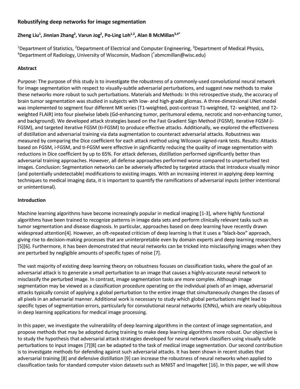 Purpose: The purpose of this study is to investigate the robustness of a commonly-used convolutional neural network for image segmentation with respect to visually-subtle adversarial perturbations, and suggest new methods to make these networks more robust to such perturbations. Materials and Methods: In this retrospective study, the accuracy of brain tumor segmentation was studied in subjects with low- and high-grade gliomas. A three-dimensional UNet model was implemented to segment four different MR series (T1-weighted, post-contrast T1-weighted, T2- weighted, and T2-weighted FLAIR) into four pixelwise labels (Gd-enhancing tumor, peritumoral edema, necrotic and non-enhancing tumor, and background). We developed attack strategies based on the Fast Gradient Sign Method (FGSM), iterative FGSM (i-FGSM), and targeted iterative FGSM (ti-FGSM) to produce effective attacks. Additionally, we explored the effectiveness of distillation and adversarial training via data augmentation to counteract adversarial attacks. Robustness was measured by comparing the Dice coefficient for each attack method using Wilcoxon signed-rank tests. Results: Attacks based on FGSM, i-FGSM, and ti-FGSM were effective in significantly reducing the quality of image segmentation with reductions in Dice coefficient by up to 65%. For attack defenses, distillation performed significantly better than adversarial training approaches. However, all defense approaches performed worse compared to unperturbed test images. Conclusion: Segmentation networks can be adversely affected by targeted attacks that introduce visually minor (and potentially undetectable) modifications to existing images. With an increasing interest in applying deep learning techniques to medical imaging data, it is important to quantify the ramifications of adversarial inputs (either intentional or unintentional).